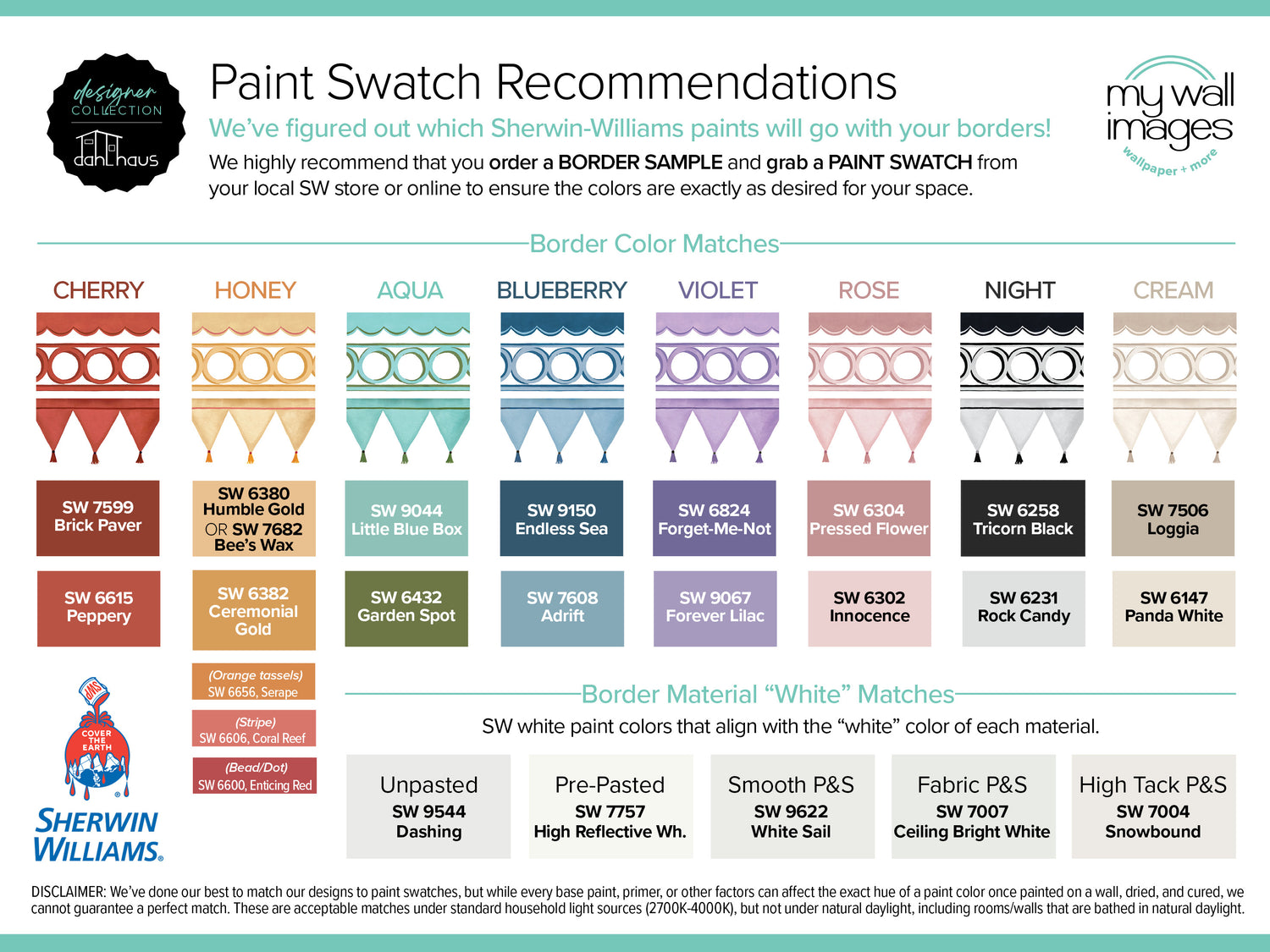 We've made it so easy for your to match our borders with SW paints! Every border color has been carefully paired with a color. PLUS we've even matched the "WHITE" of the border to match white walls, if desired.