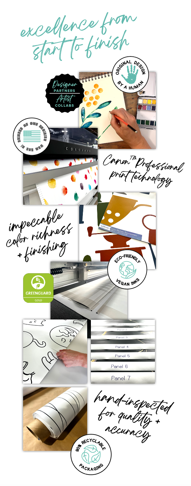 Sketches, brainstorms, and collaborations with artists inspire our wallpaper collections. Many of our designs are created from scratch--yes, a pencil on paper and real paint! Some wallpapers are designed using digital design tools manually and for others we partner with artists and designers to compile the best wallpaper collections to offer you!