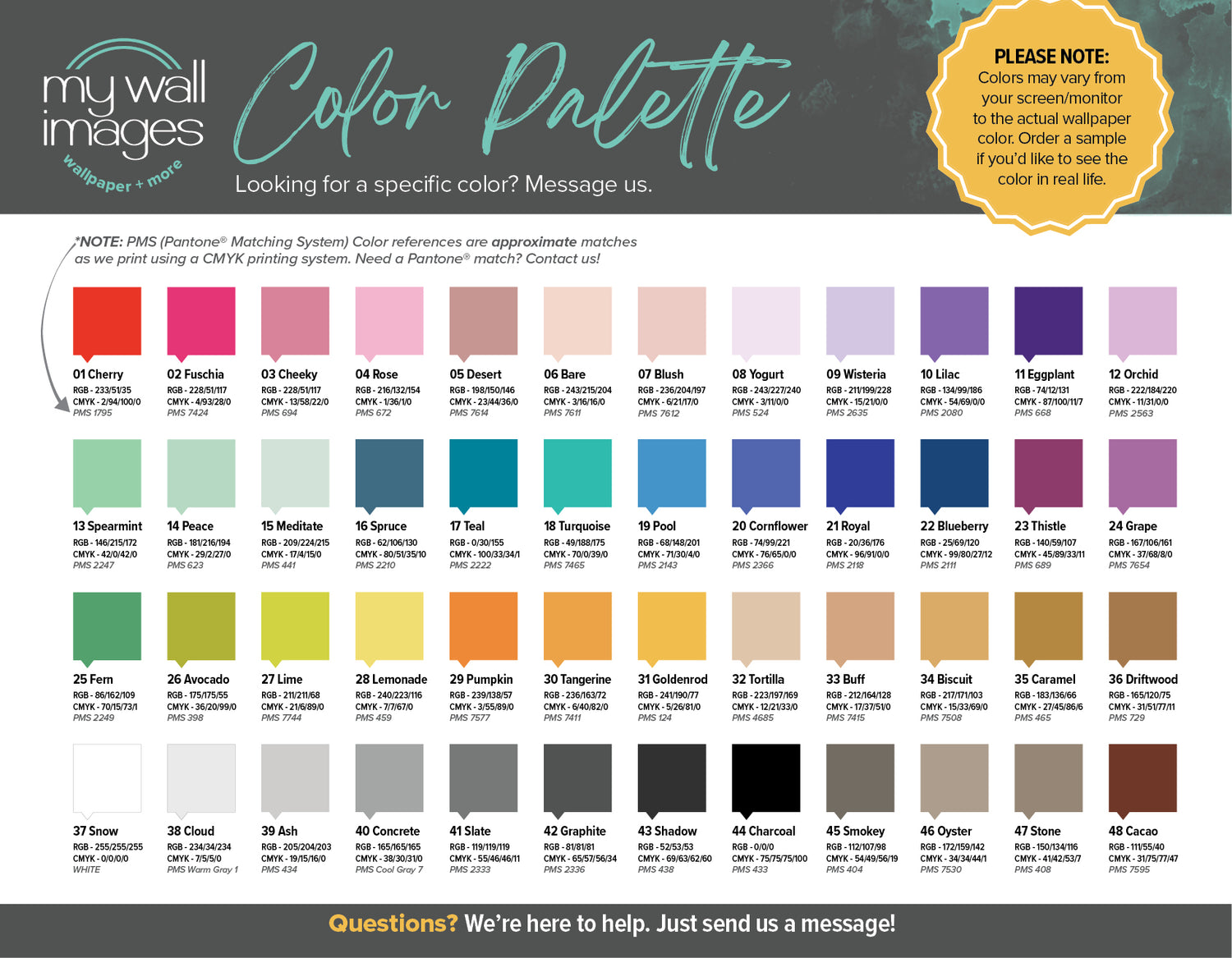 Here are just a few ideas of colors that we can swap out for your wallpaper project. Most of our wallpaper patterns are able to be adjusted to a color of your choice. Share your wallpaper vision with us!