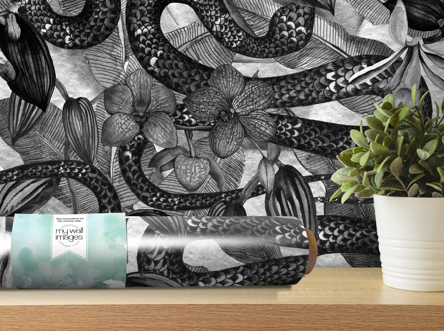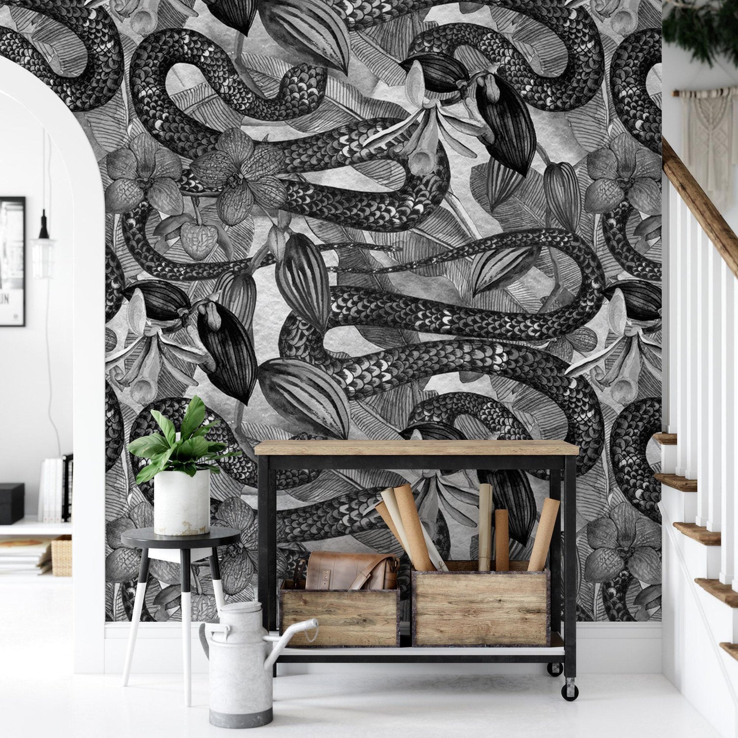 Black and White Flowers and Snake, Wallpaper Reptile, Removable Wallpaper, Peel and Stick Wallpaper, Mural, Room Decor, Accent Wall
