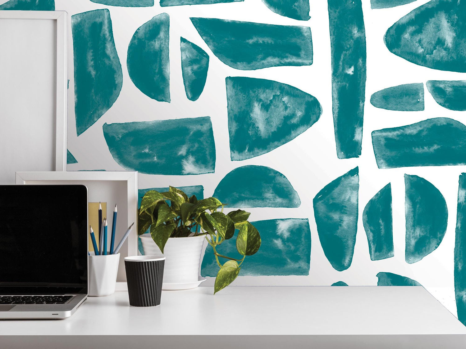 Boho Teal Blue Mosaic Stones Removable Wallpaper, Wall Art, Peel and Stick Wallpaper, Wall Decor, Accent Wall, Watercolor, Modern, MW2038