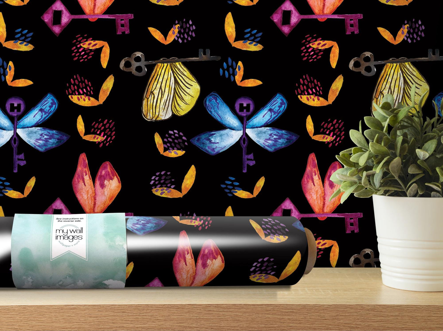 Potter Watercolor Flying Keys on Black Removable Wallpaper, Peel and Stick Wallpaper, Wall Art, Wall Decor