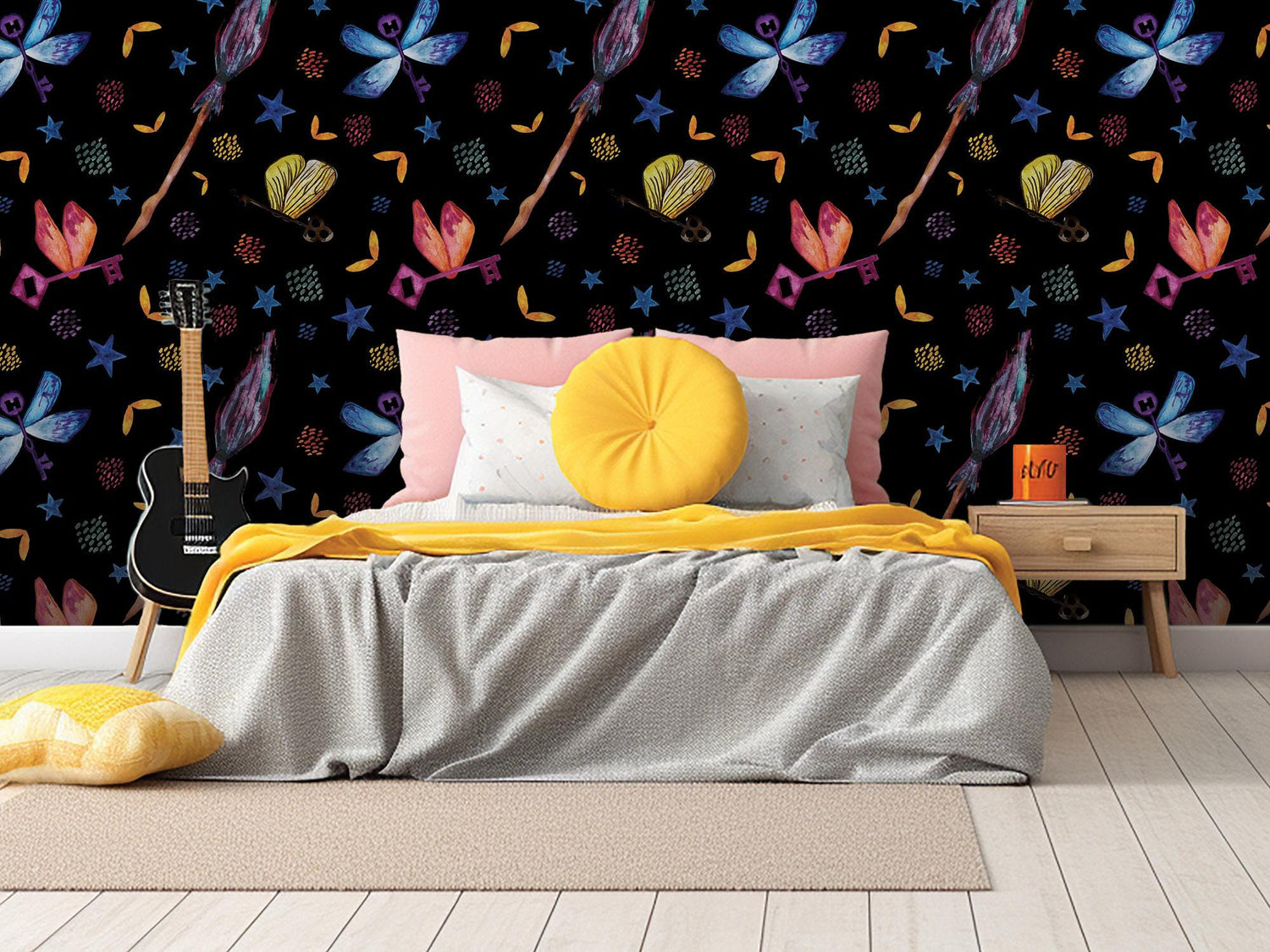 Enchanted Potter Flying Keys Black Removable Wallpaper, Wall Art, Peel and Stick Wallpaper, Wall Decor, Harry Pottery, Kids Room, Art MW2040