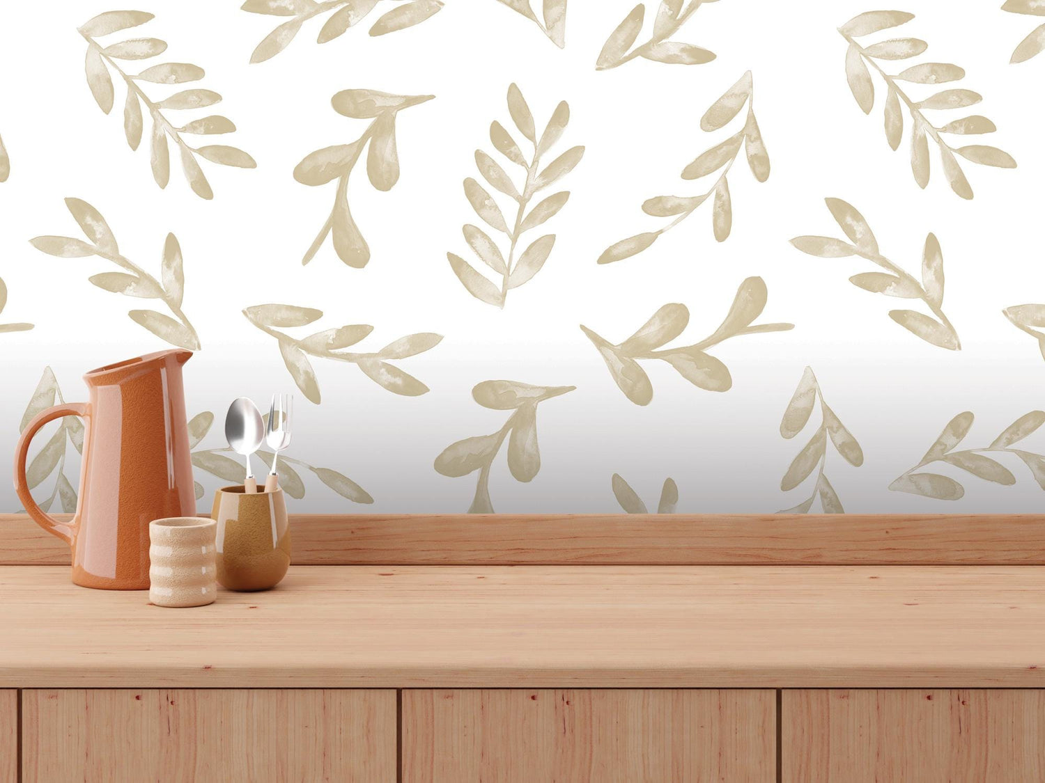 Floating Soft Beige Tan Watercolor Leaves on White Removable Wallpaper, Peel and Stick Wallpaper, Wall Art, Wall Decor