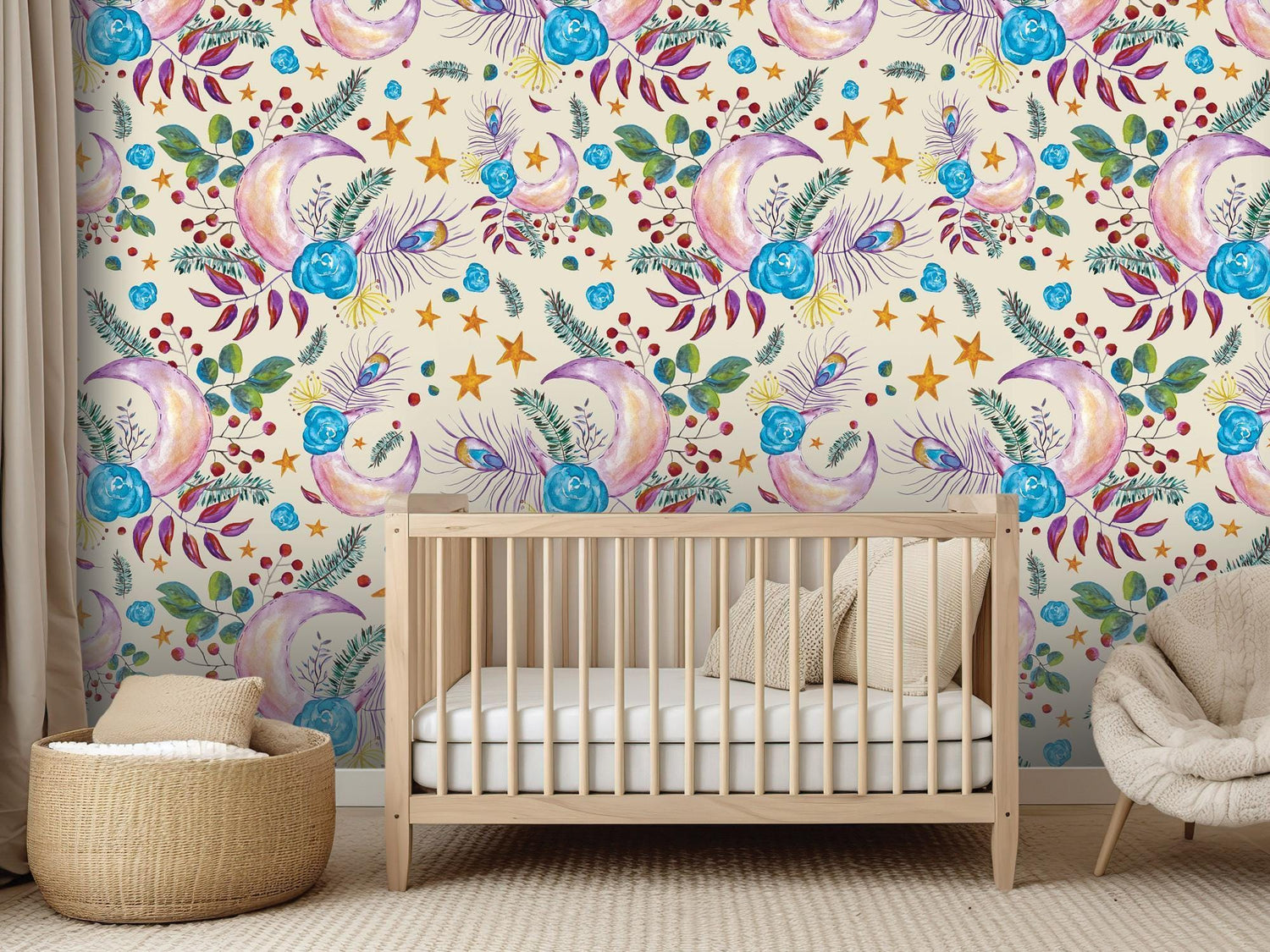 Floral Moon Boho on Cream Removable Wallpaper, Wall Art, Peel and Stick Wallpaper, Wall Decor, Accent Wall, Bedroom Decor, Nursery, MW1996