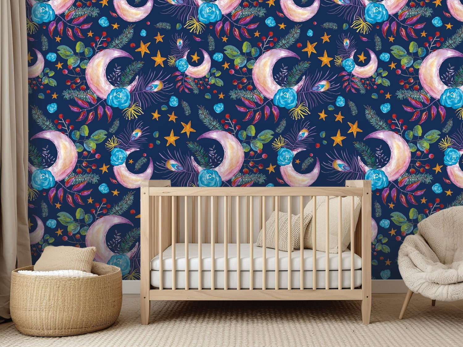 Watercolor Floral Moon Party Boho on Navy Removable Wallpaper, Peel and Stick Wallpaper, Wall Art, Wall Decor