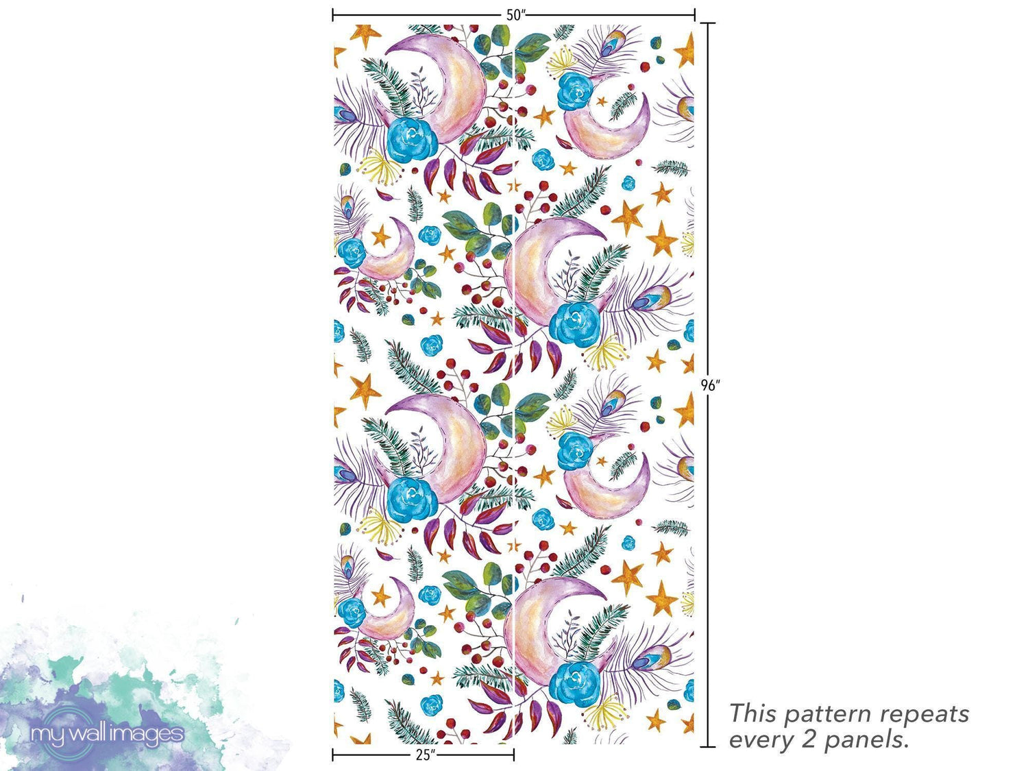 Watercolor Floral Moon Party Boho on White Removable, Peel and Stick Wallpaper, Wall Art, Wall Decor