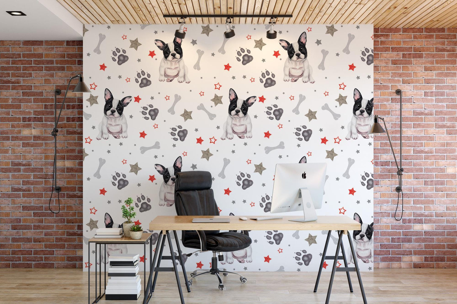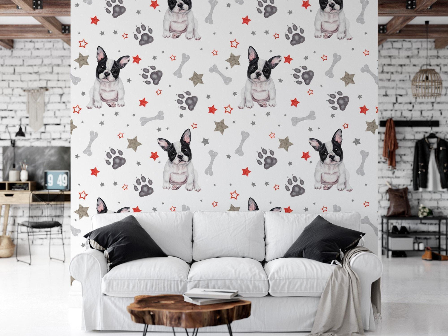 French Bulldog Puppies Pawprints, Bones, Red Stars Removable Background, Mural, Nursery, Decor, Accent, Red, Black, White