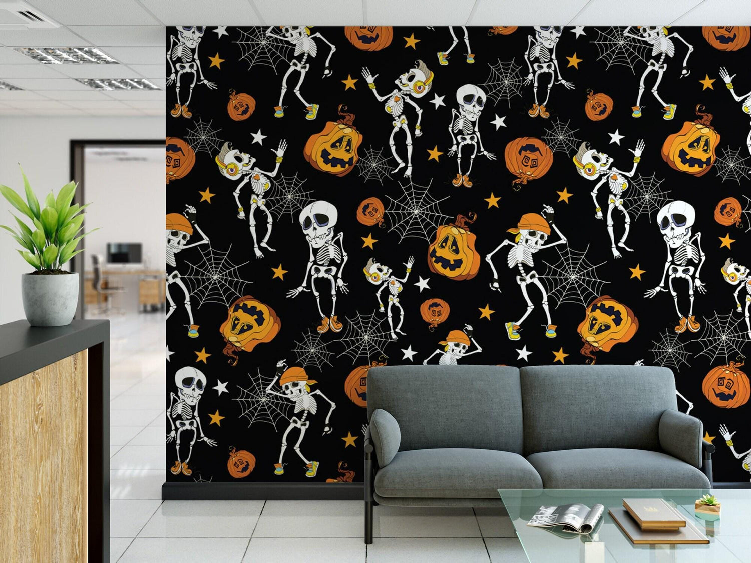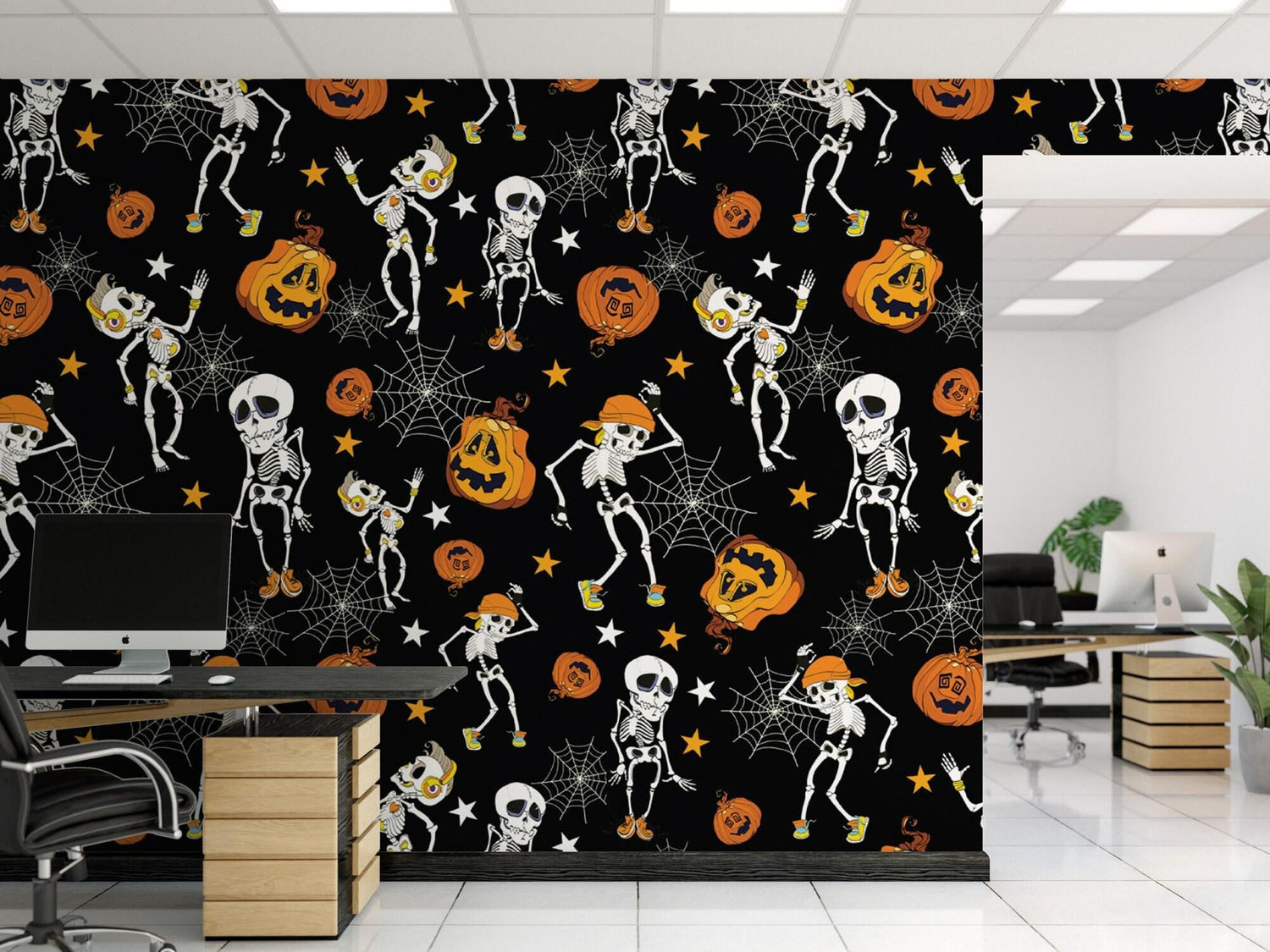 Halloween Dancing Skeletons and Pumpkins Removable Wallpaper, Wall Art, Peel and Stick Wallpaper, Fall Wallpaper, Accent Wall, MW1916