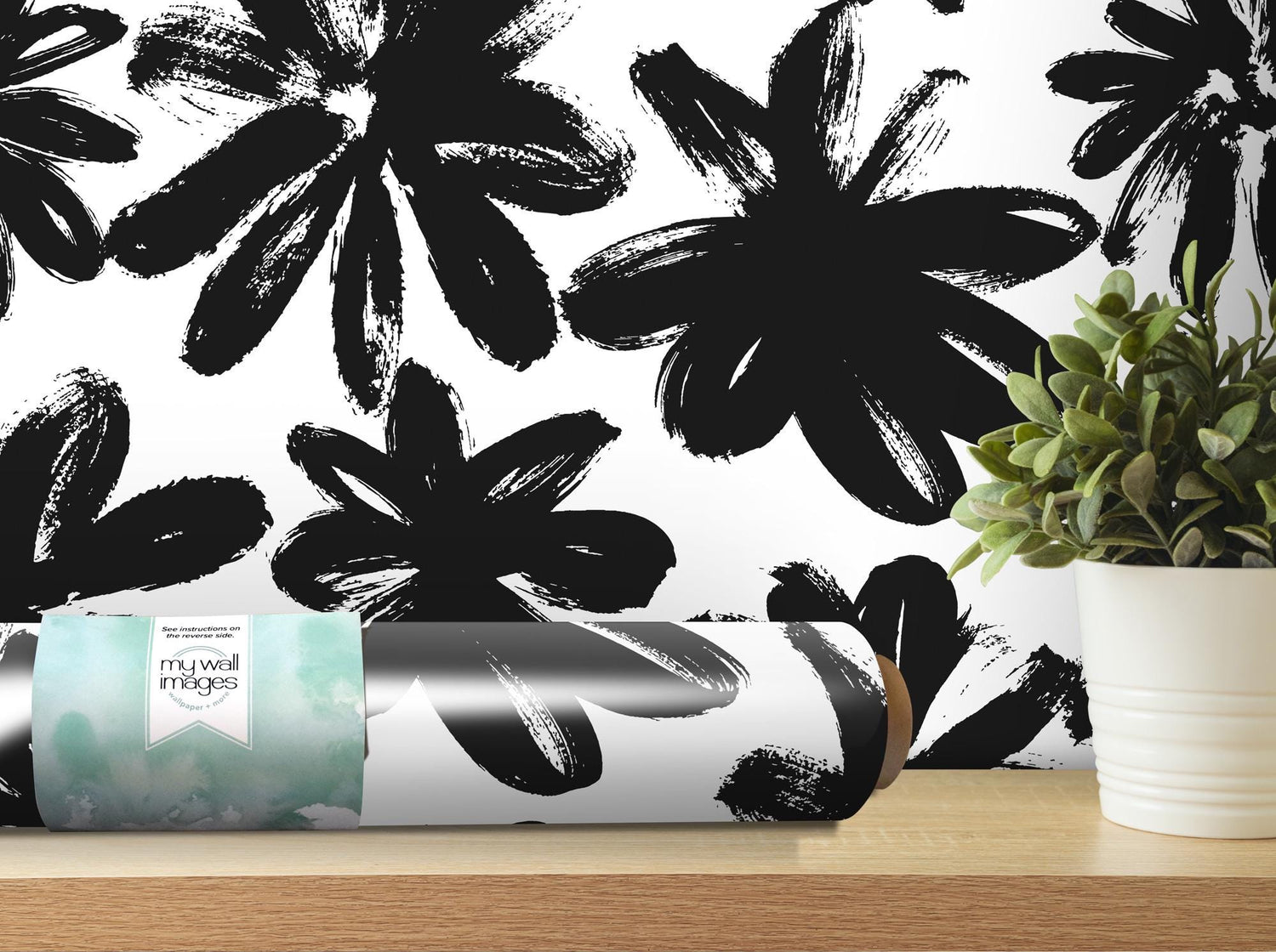 Hand Drawn Black Floral Removable Wallpaper, Wall Art, Peel and Stick Wallpaper, Mural Room Decor, Accent Wall, Black White Art