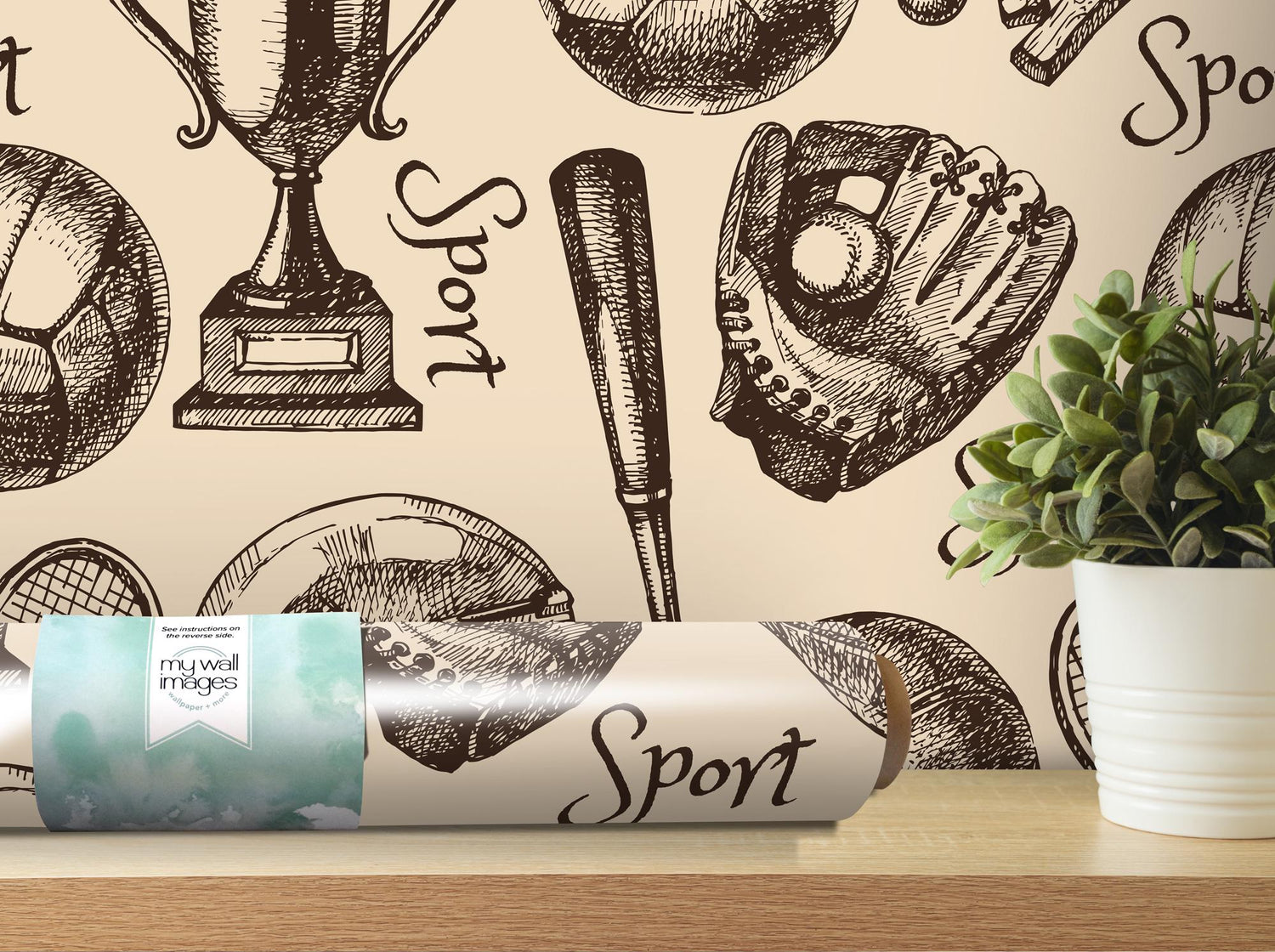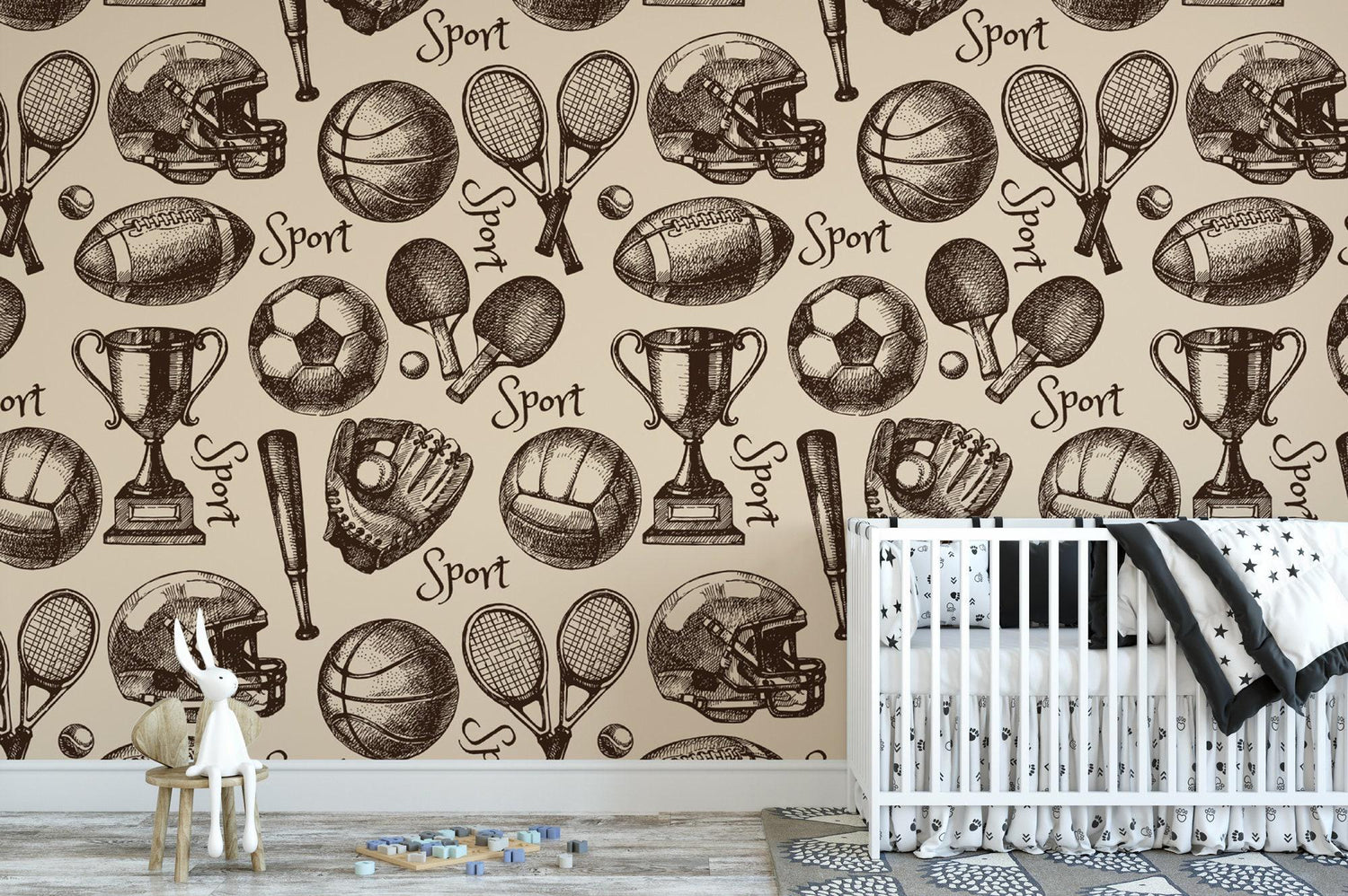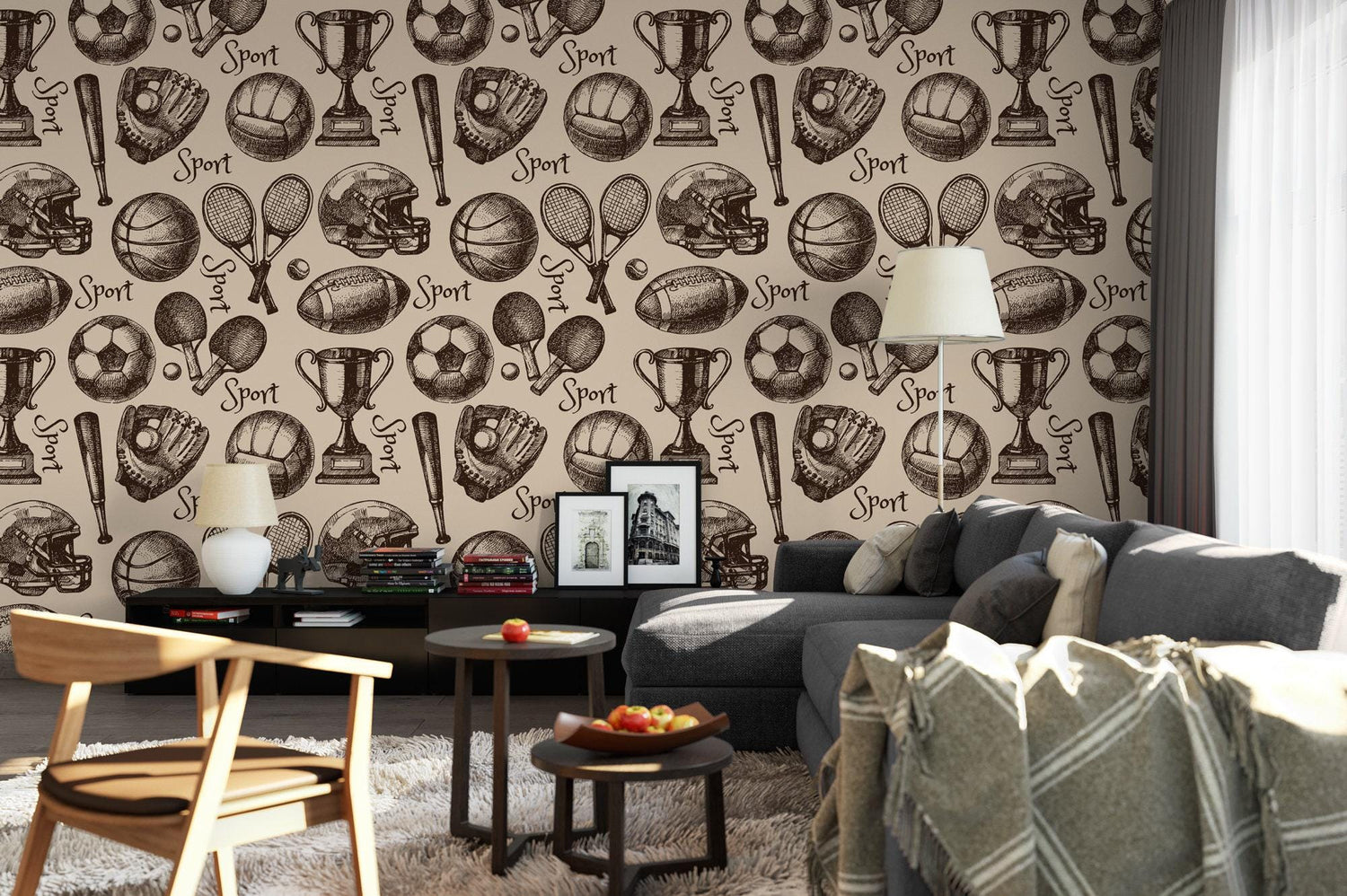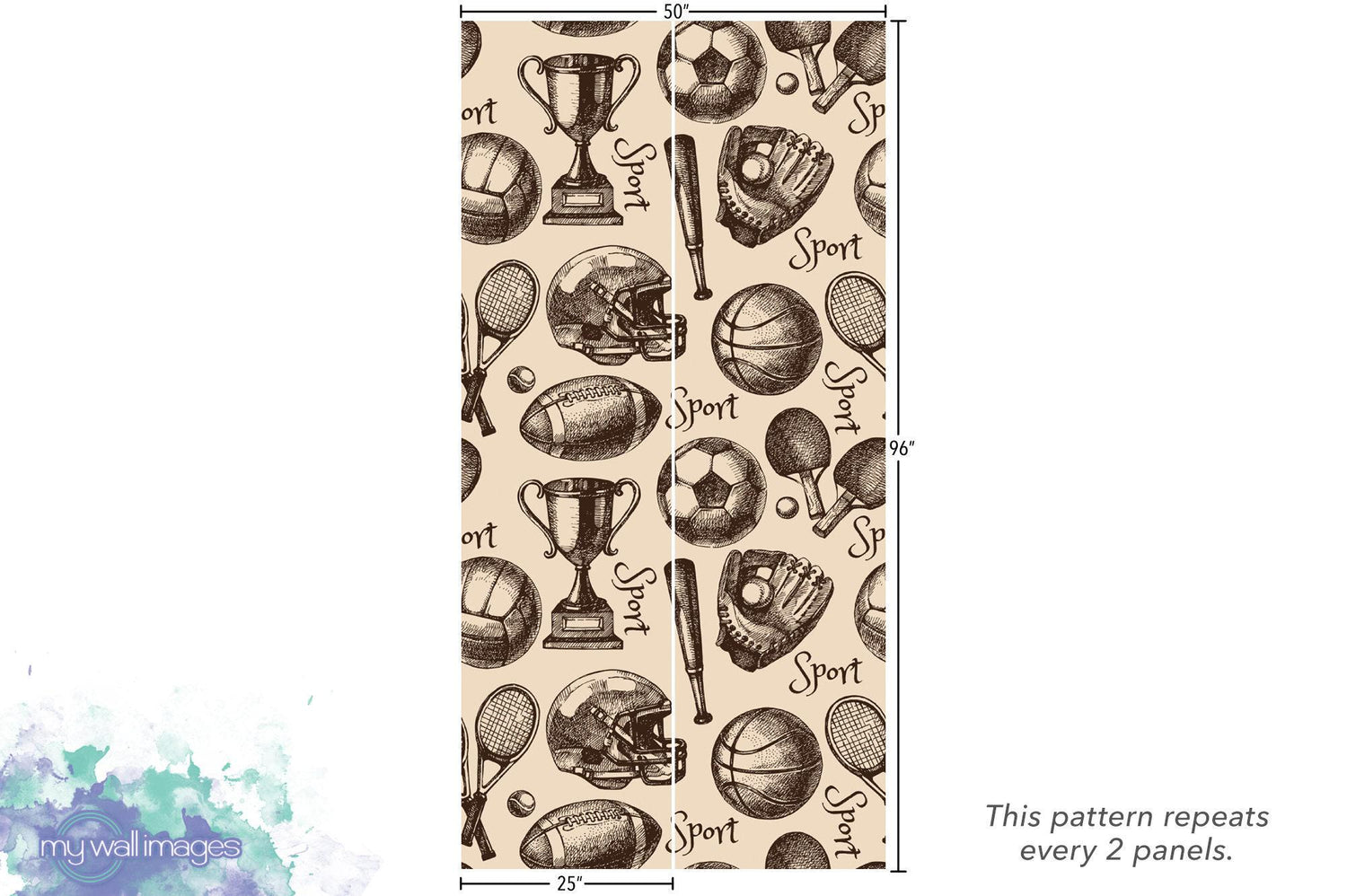 Hand Drawn Sports Themed Removable Wallpaper, Wall Art, Peel and Stick Wallpaper, Mural, Sports Boys Room, Accent Wall
