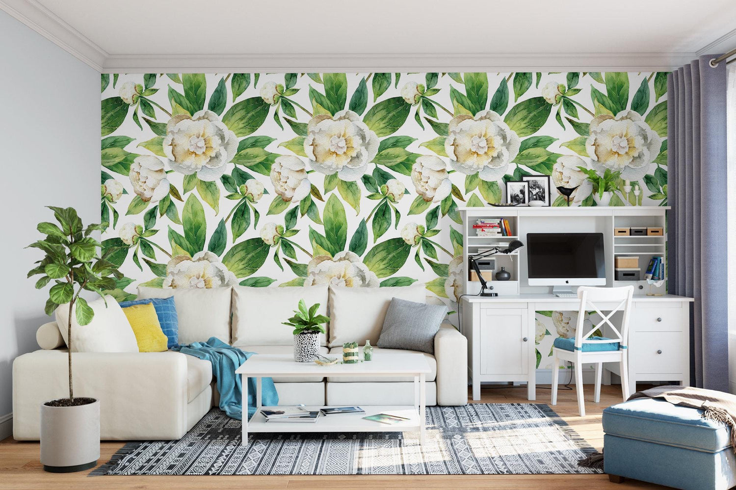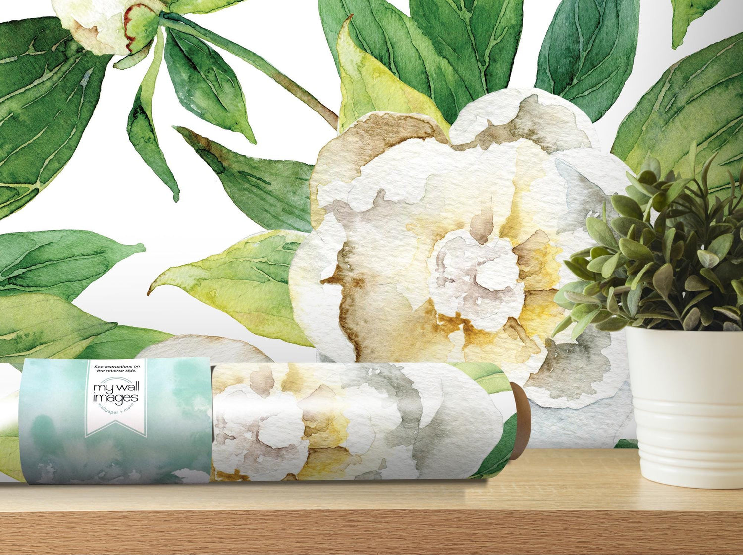 Peonies with Green Leaves Floral Removable Wallpaper, Wall Art, Peel and Stick Wallpaper, Mural Room Decor, Accent, Tropical Decor