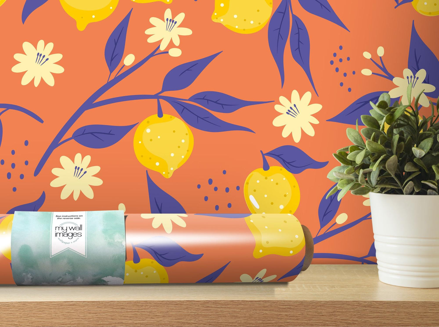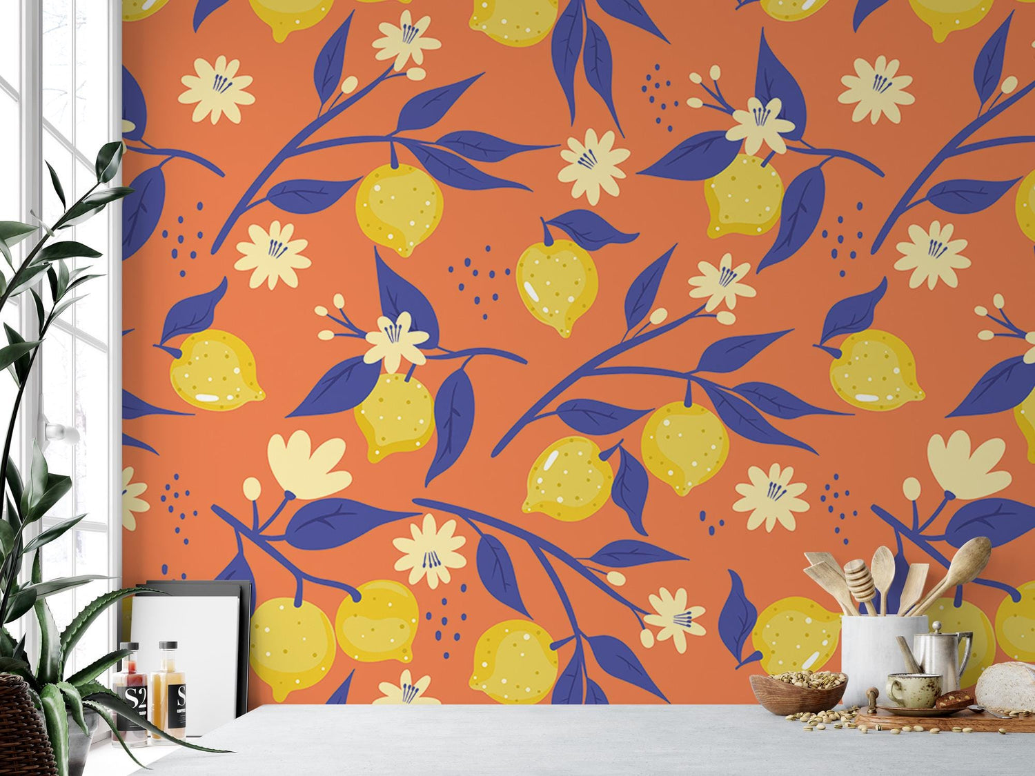 Lemons on Orange Peel and Stick Wallpaper, Removable Wallpaper, Traditional Wallpaper - Wall Art, Kitchen Decor, Fruit Art