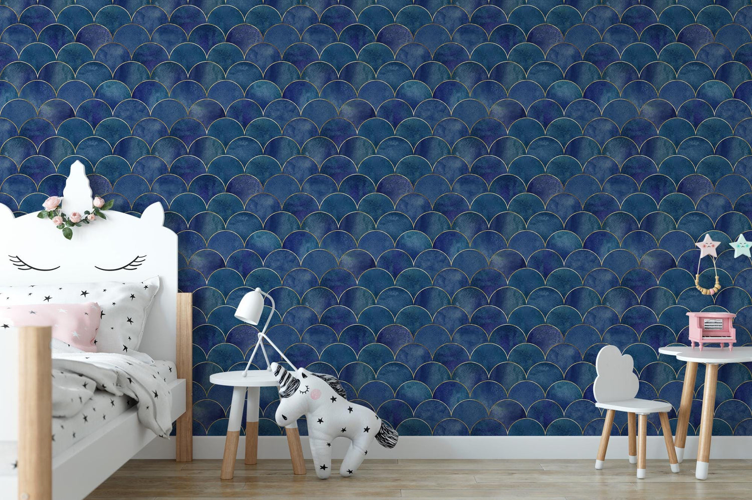 Mermaid Blue Fish Scale Removable Wallpaper, Wall Art, Peel and Stick Wallpaper, Mermaid Mural, Ocean Wallpaper, Girls Room Decor