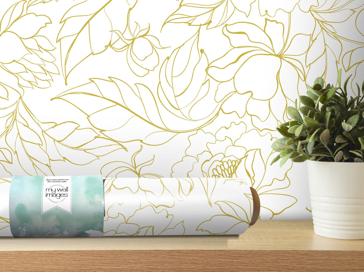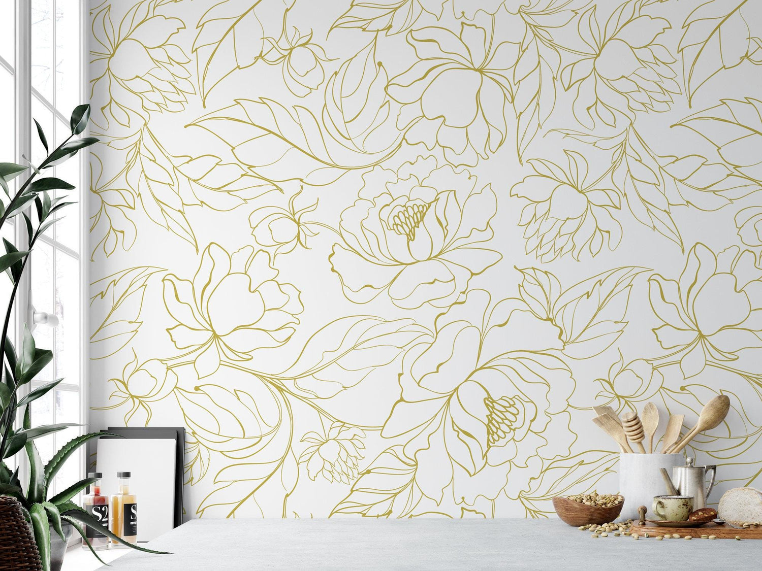 Modern White & Gold Floral Minimalist Removable Wallpaper, Wall Art, Peel and Stick Wallpaper, Modern Room Decor, Accent Wall