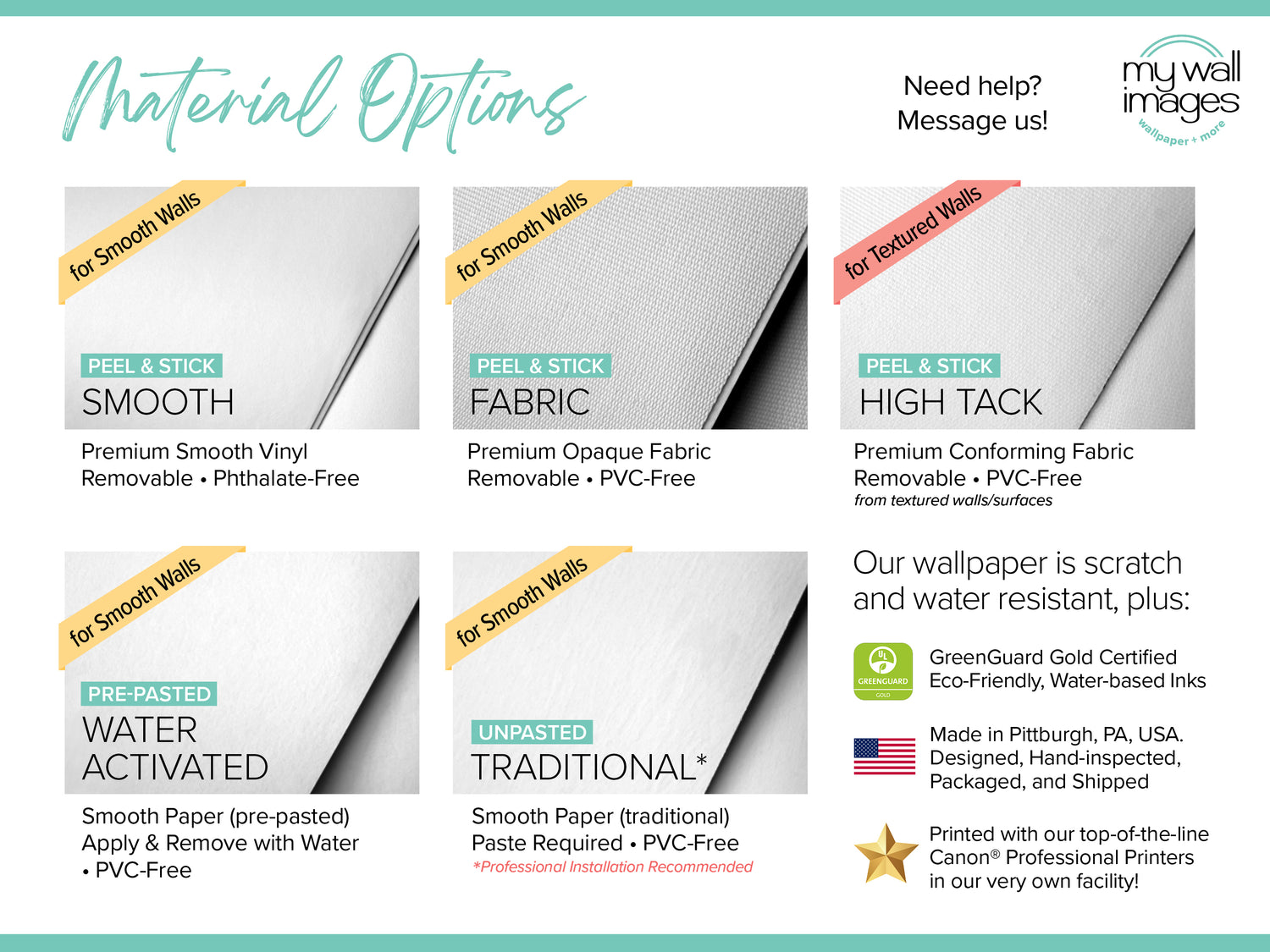 Our peel and stick wallpaper panels come pre-trimmed to your ceiling height and are clearly labeled for easy alignment, eliminating guesswork. Each panel features a 3/4” overlap to ensure seamless pattern matching, except for our high tack option which lines up perfectly on the edge. Made with eco friendly wallpaper materials and using GreenGuard Gold certified inks, this wallpaper is scratch resistant and water resistant. Water-activated, prepasted wallpaper and unpasted, traditional wallpaper materials are also available.