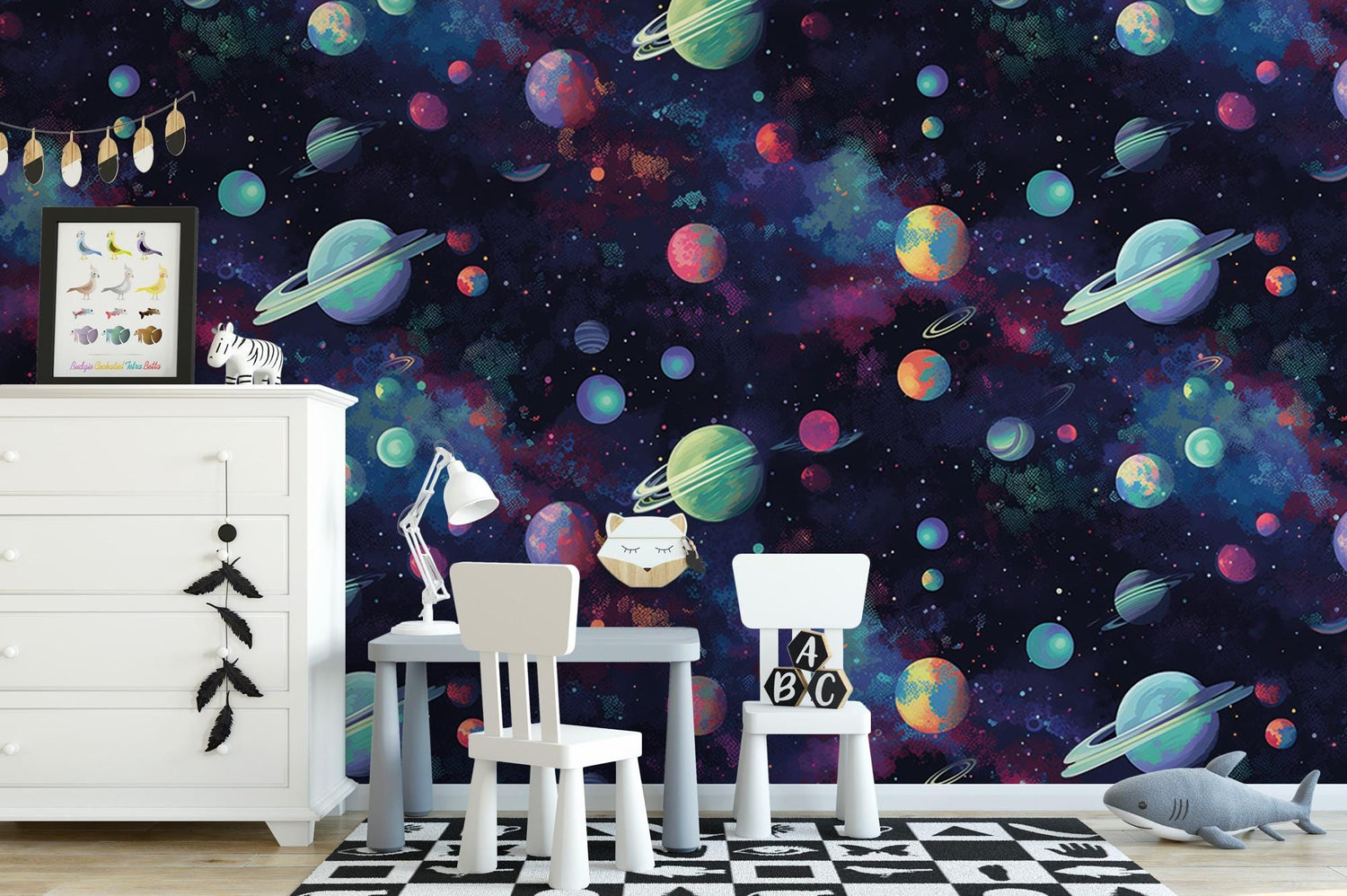 Outer Space Night Sky Planets Removable Wallpaper, Wall Art, Peel and Stick Wallpaper, Mural, Boys Nursery, Solar System Wallpaper