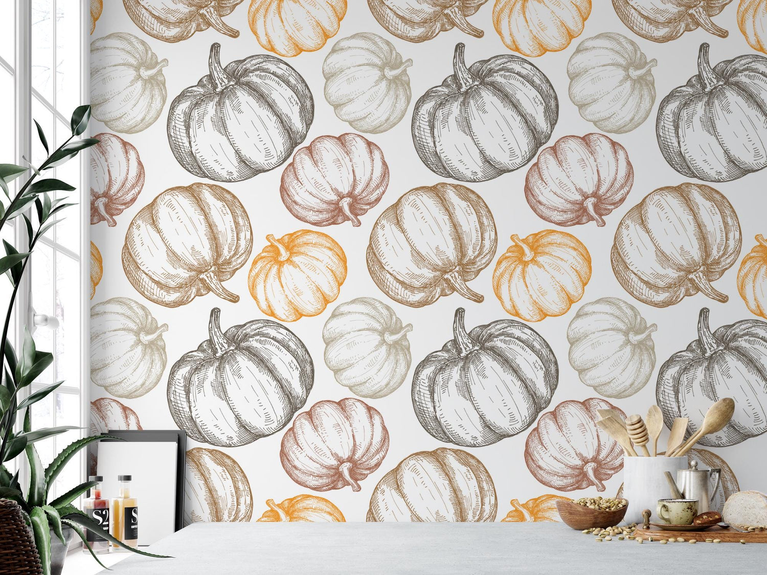 Pumpkin Sketches Removable Wallpaper, Wall Art, Peel and Stick Wallpaper, Mural, Fall Wallpaper, Accent Wall, MW1468