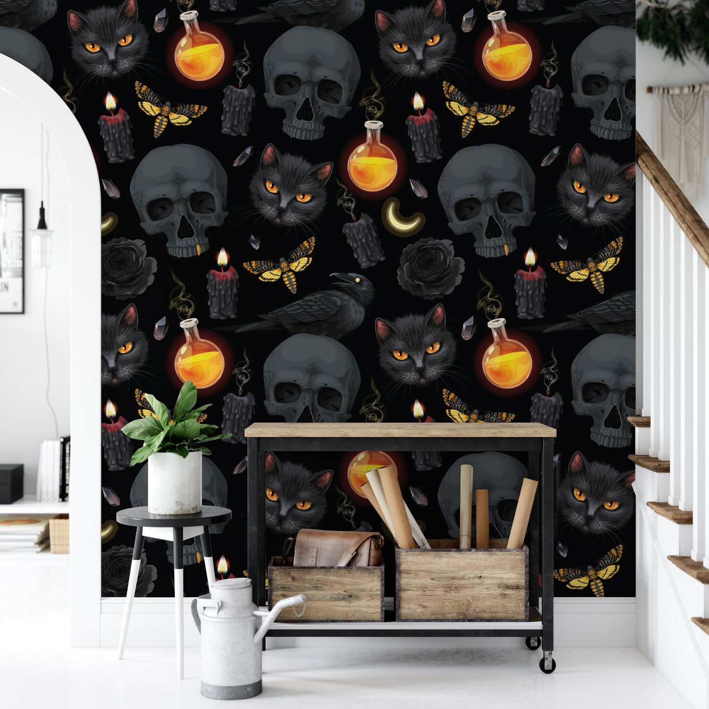 Raven and Skulls Temporary Removable Wallpaper, Wall Art, Peel and Stick Wallpaper, Mural, Fall Wallpaper, Accent Wall, MW1914