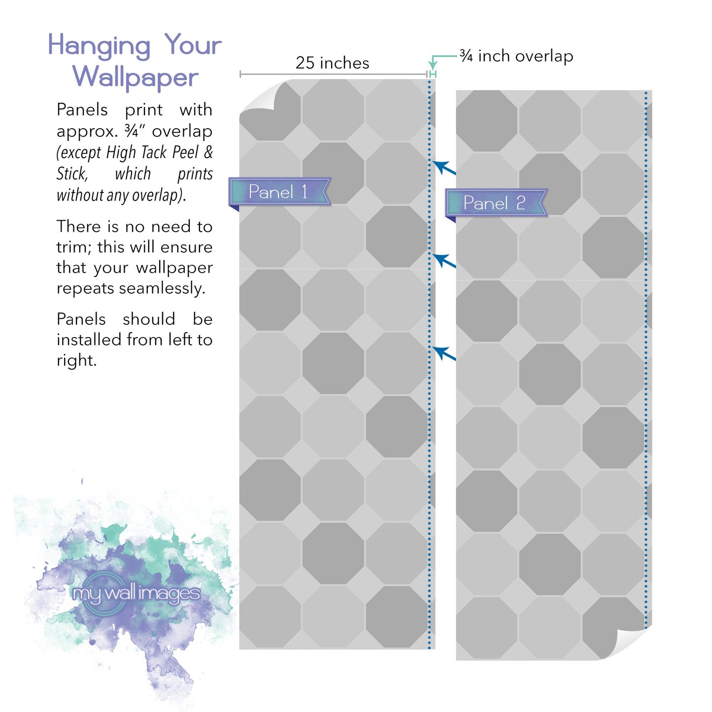 We include about 3/4” overlap on the right side of the panels to aid in aligning the design during installation. Panels should be installed from left to right.
