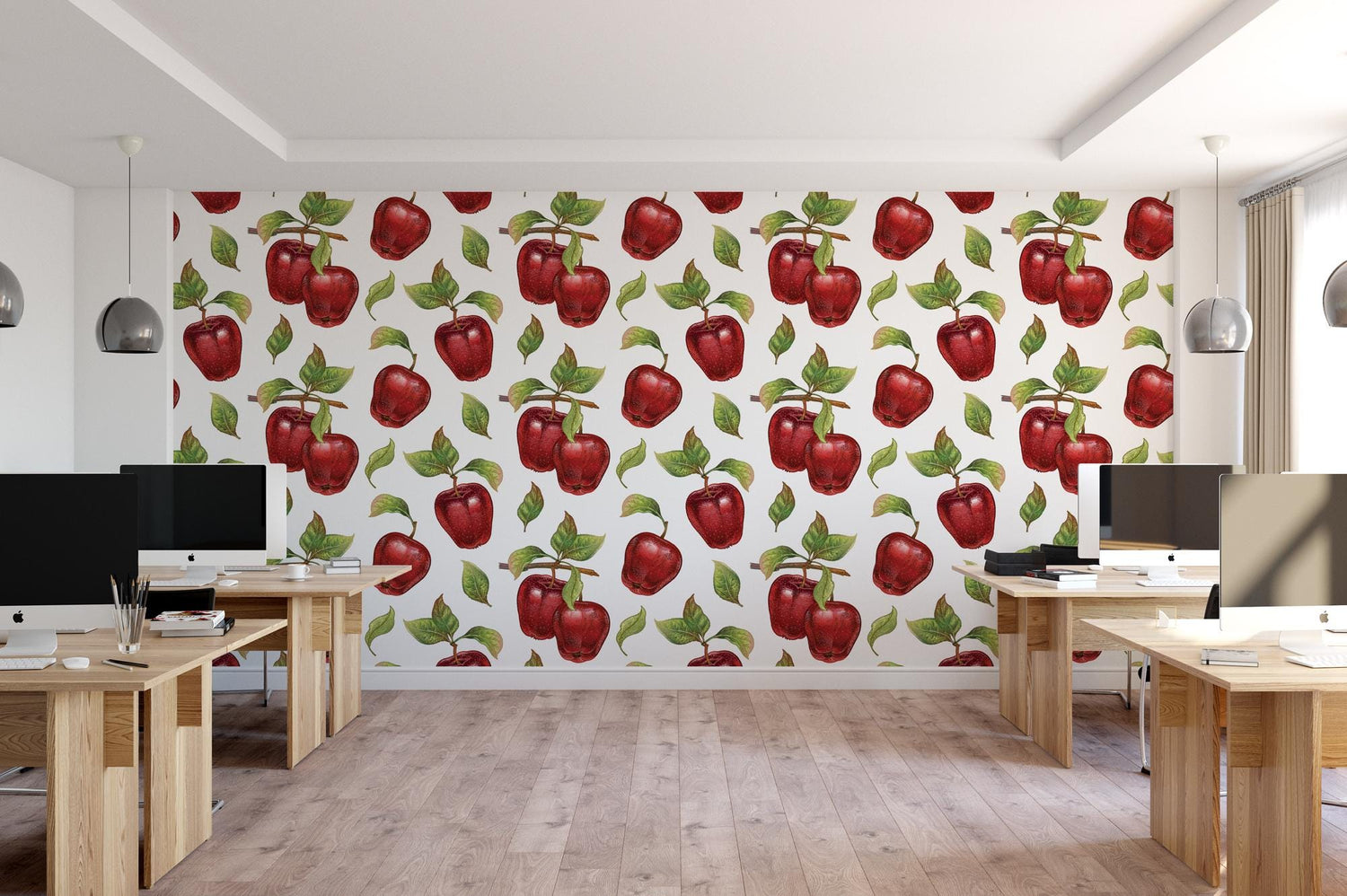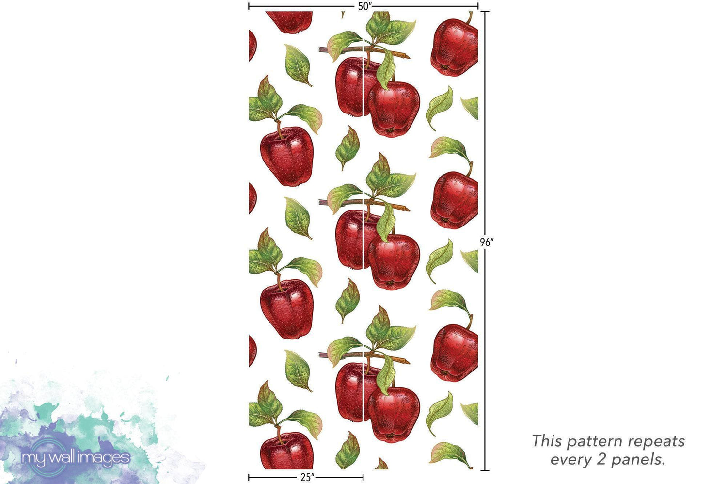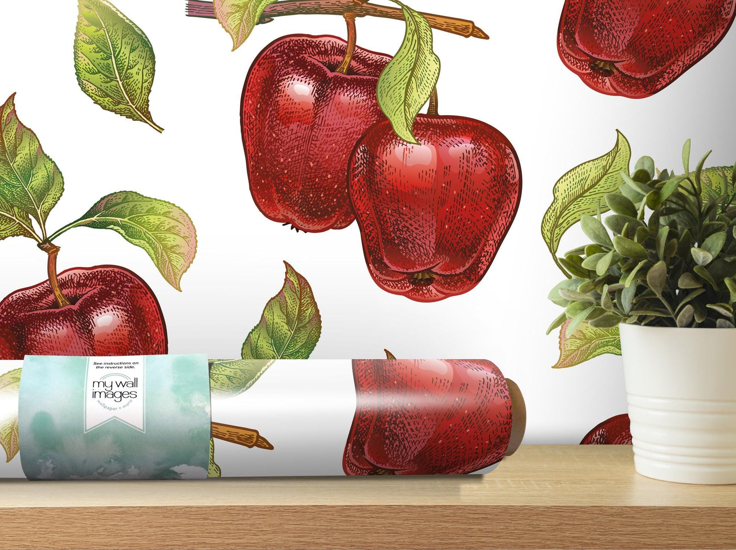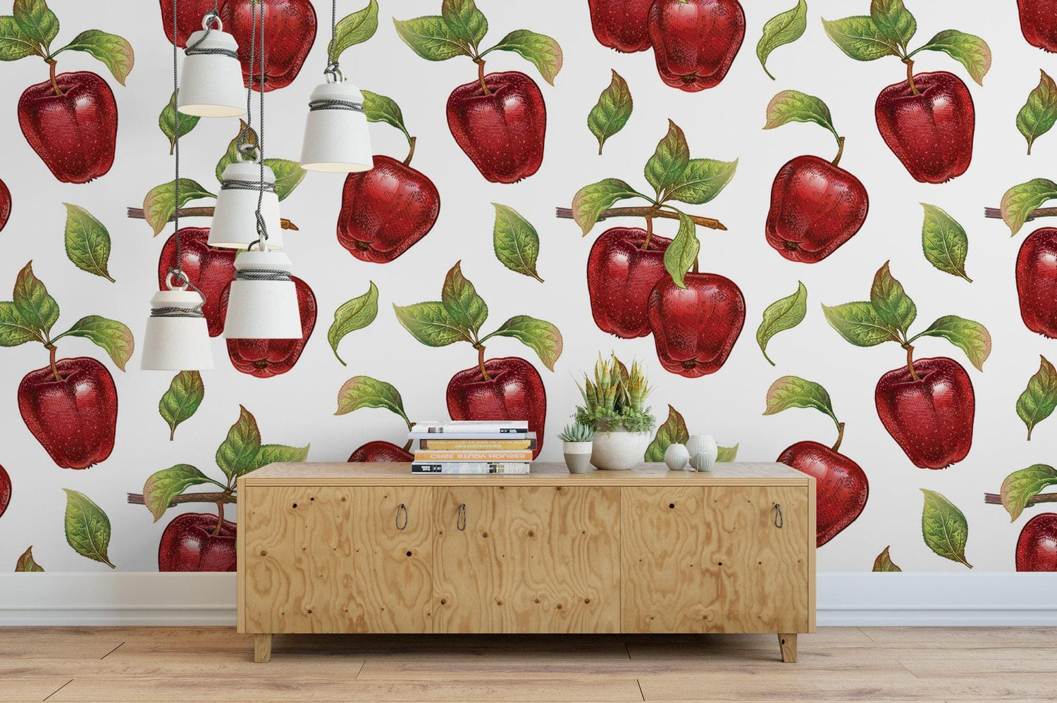 Red Apples with Leaves Peel and Stick Wallpaper, Removable Wallpaper, Traditional Wallpaper - Wall Art, Kitchen Decor, Fruit Art