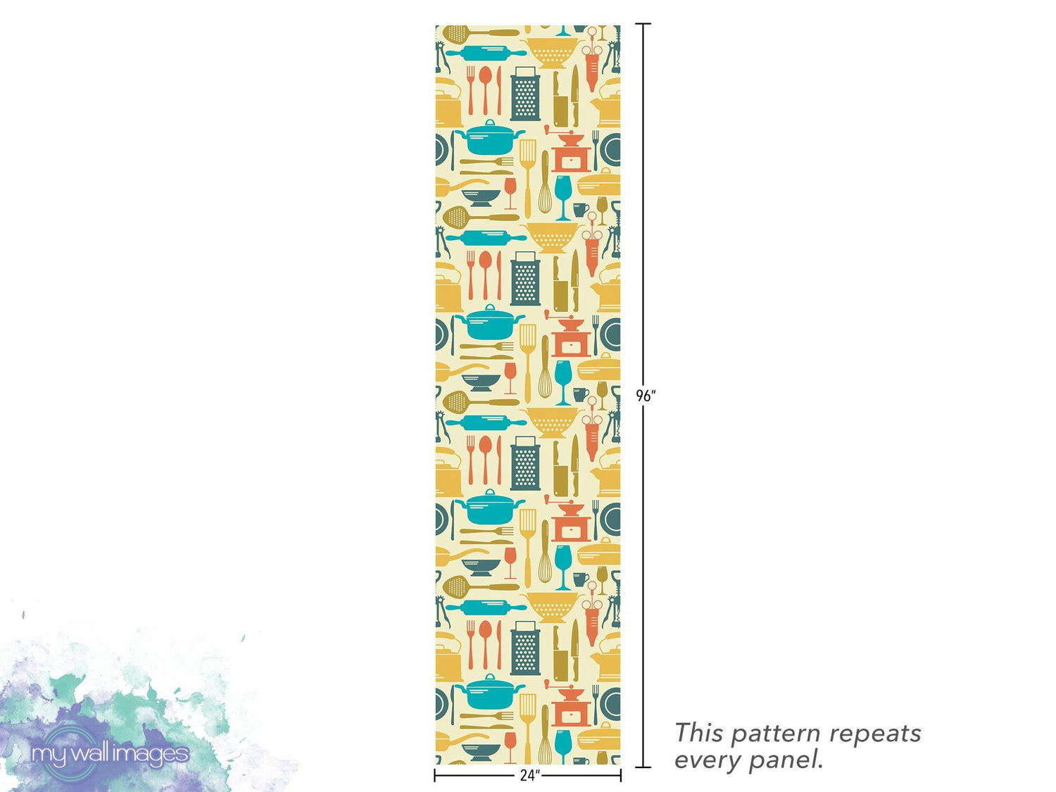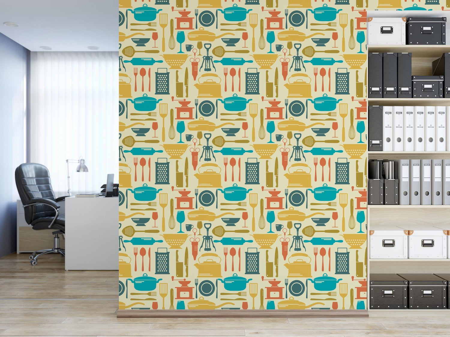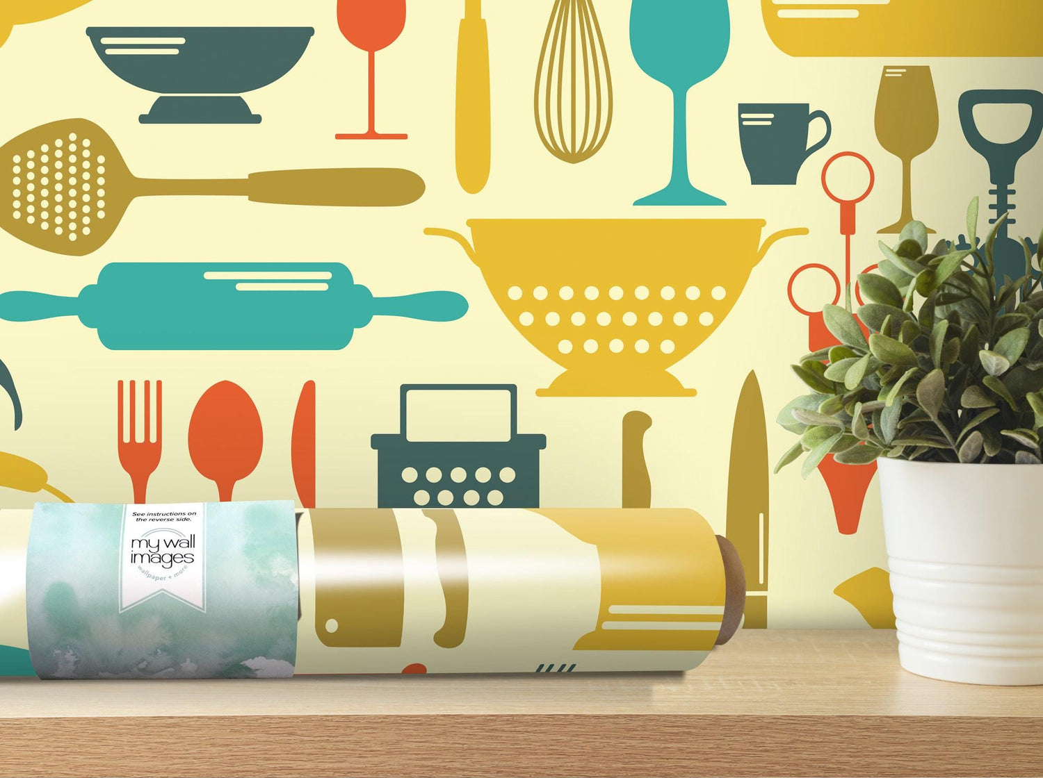 Retro Kitchen Accessories Removable Wallpaper, Wall Art, Peel and Stick Wallpaper, Kitchen Mural, Kitchen Decor, Cooking Wallpaper