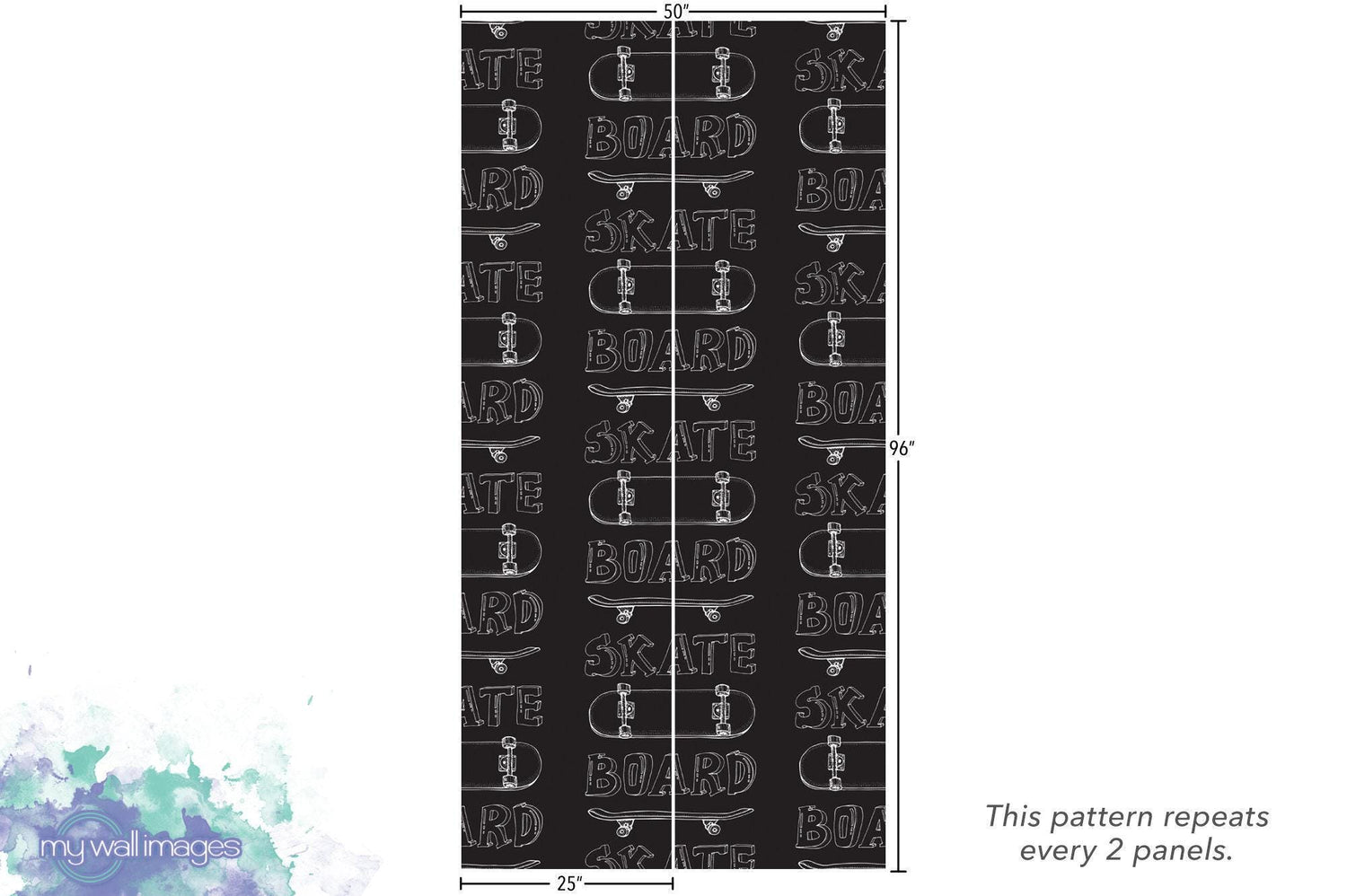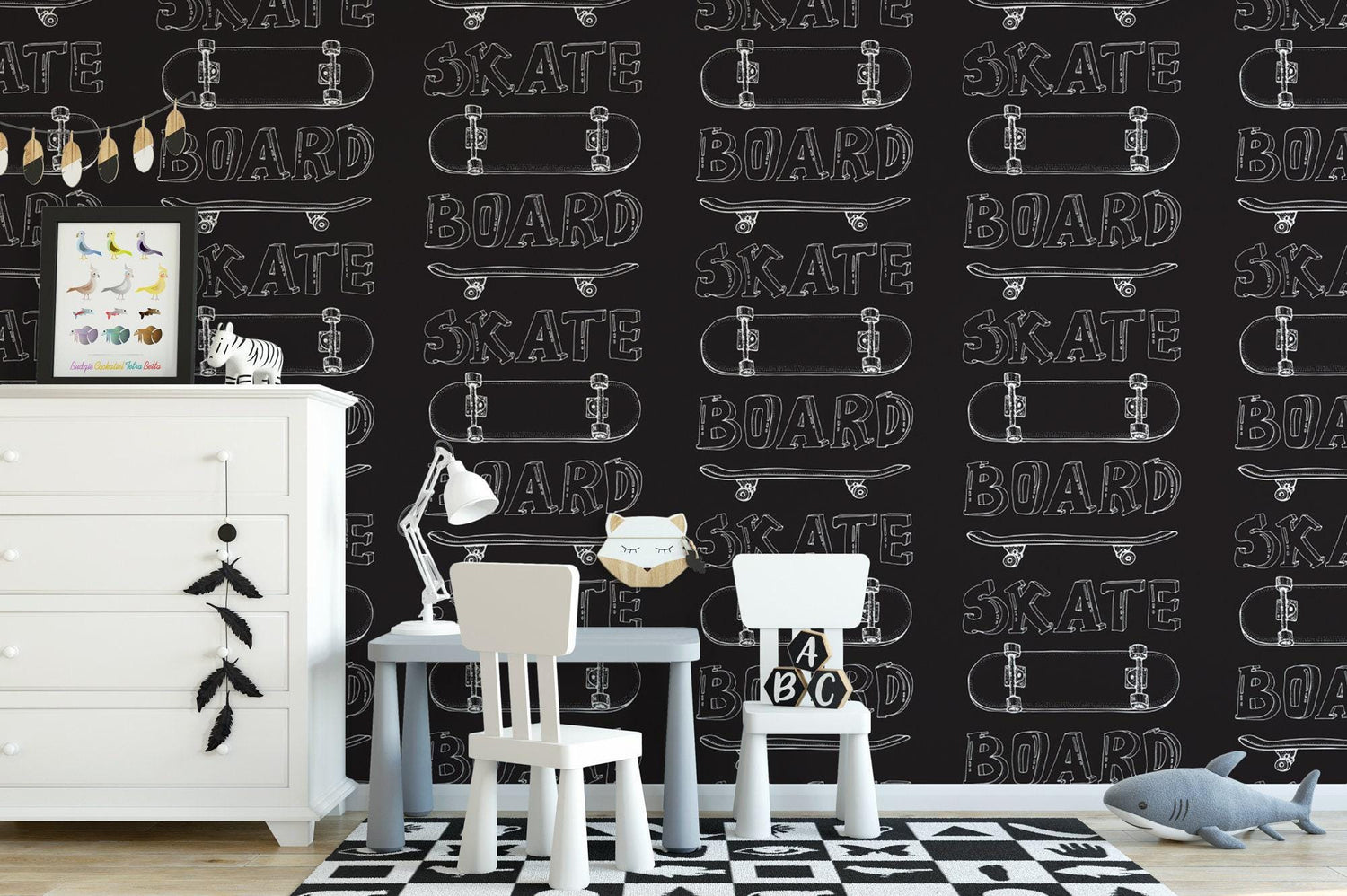 Skateboard on Black Removable Wallpaper, Wall Art, Peel and Stick Wallpaper, Kids Room Decor, Skateboard Decor, Skateboard Art