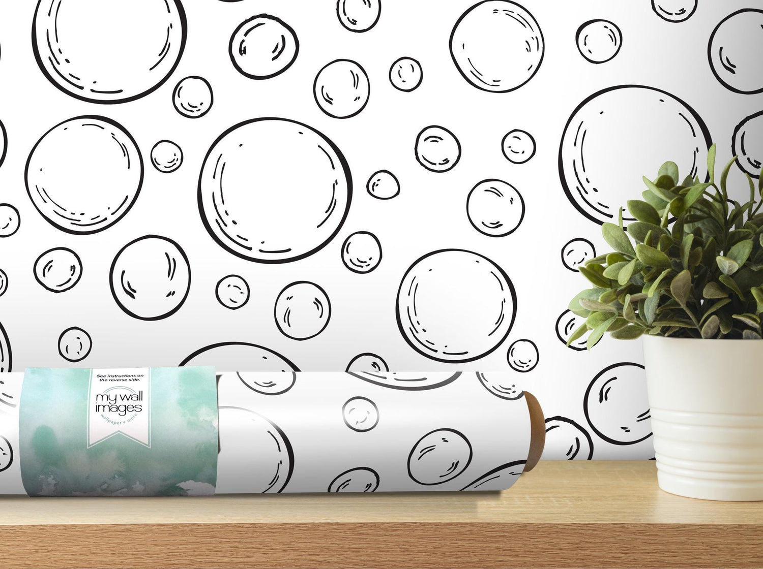 Soap Bubbles Black and White Removable Wallpaper, Wall Art, Peel and Stick Wallpaper, Bath Design, Bathroom, Accent Wall, Bath Decor