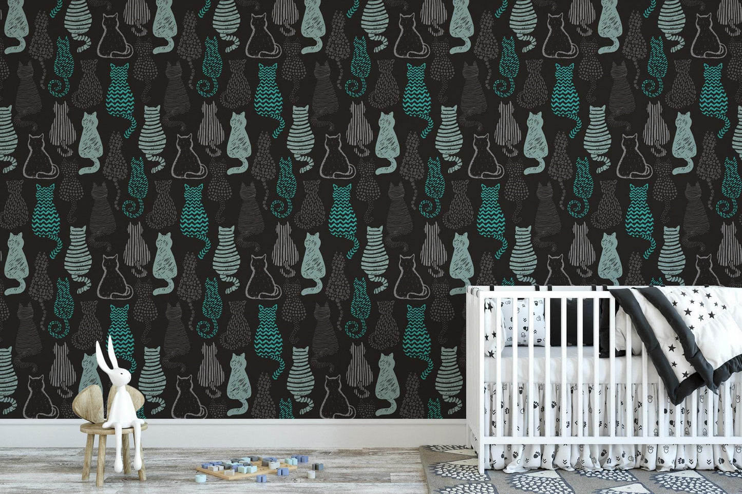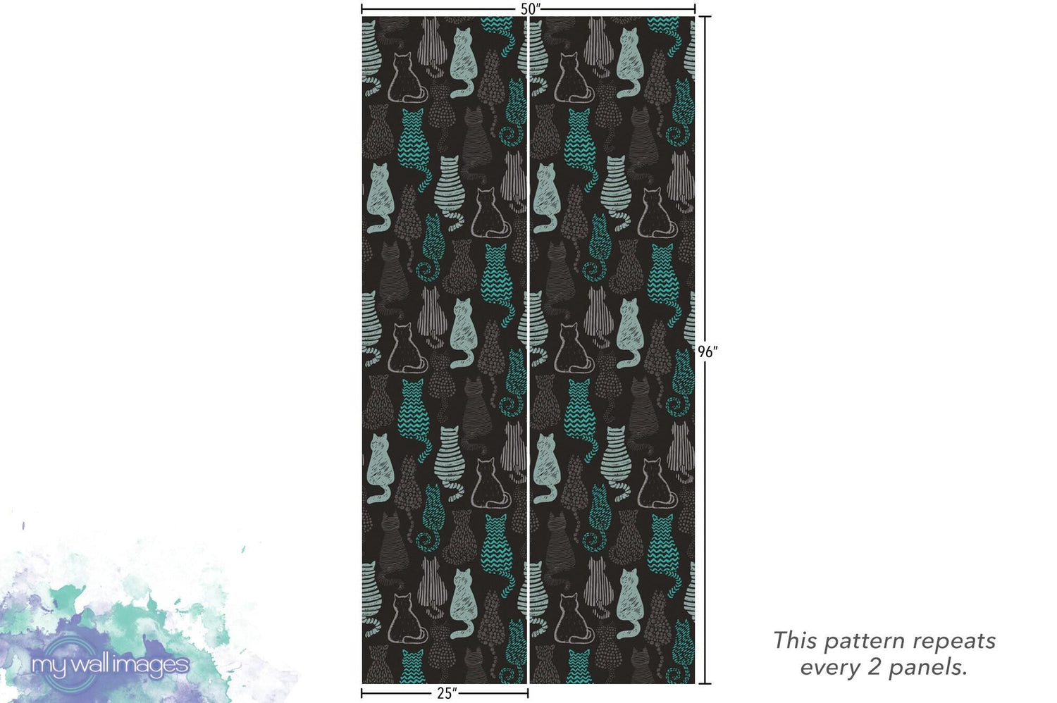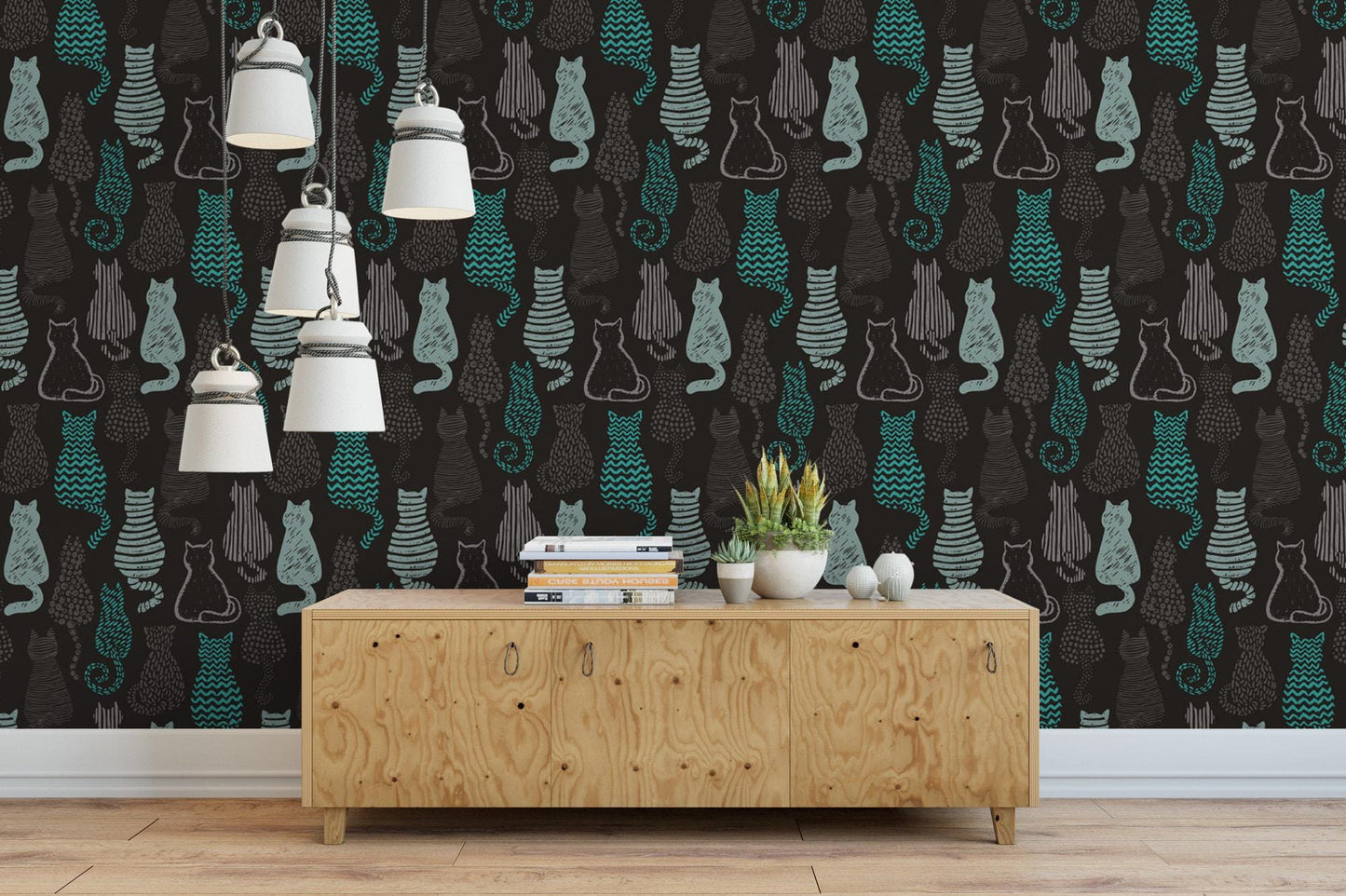 Textured Cats, Mod Kittens, Removable Wallpaper, Cat Mural, Cat Decor, Accent Wall, Black Turquoise, Accent Wall, Cat Lover Decor