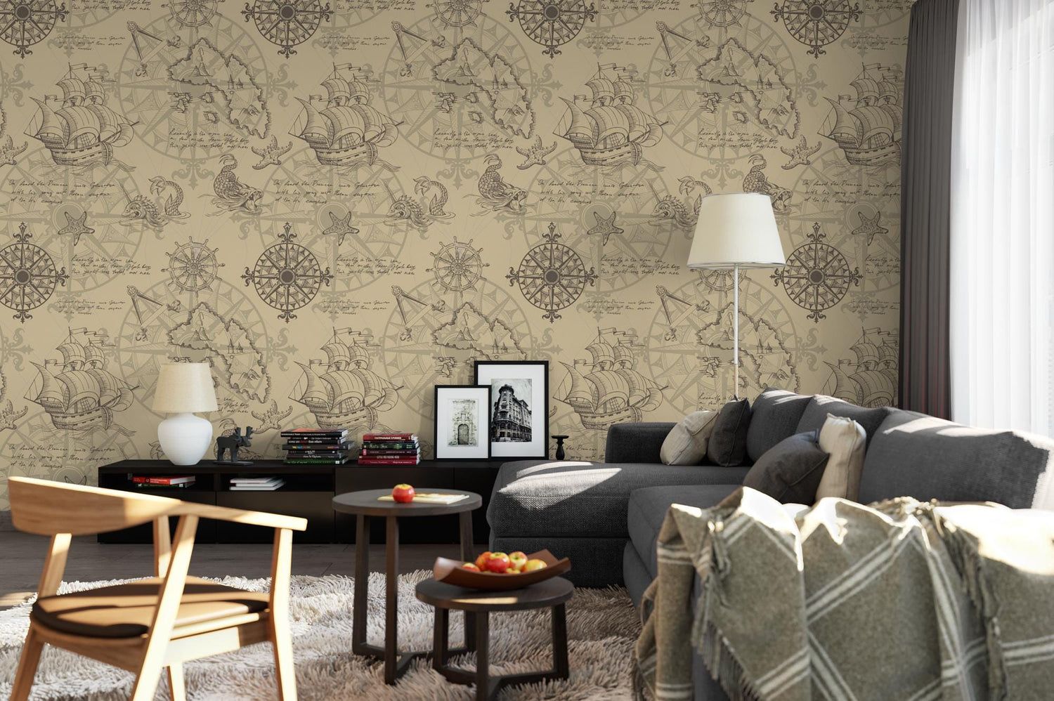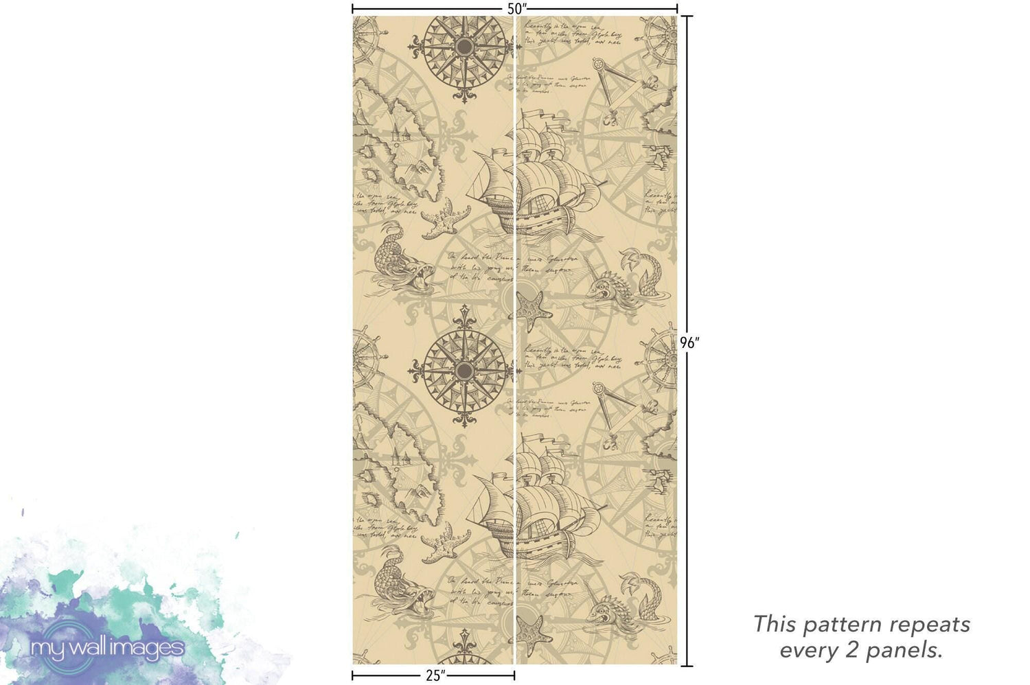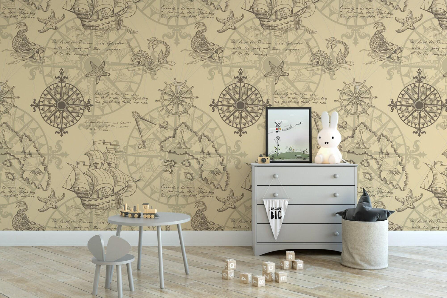 Vintage Sea Map with Sea Monsters Removable Wallpaper, Peel and Stick Wallpaper, Temporary Wall Mural, Nautical Decor Art