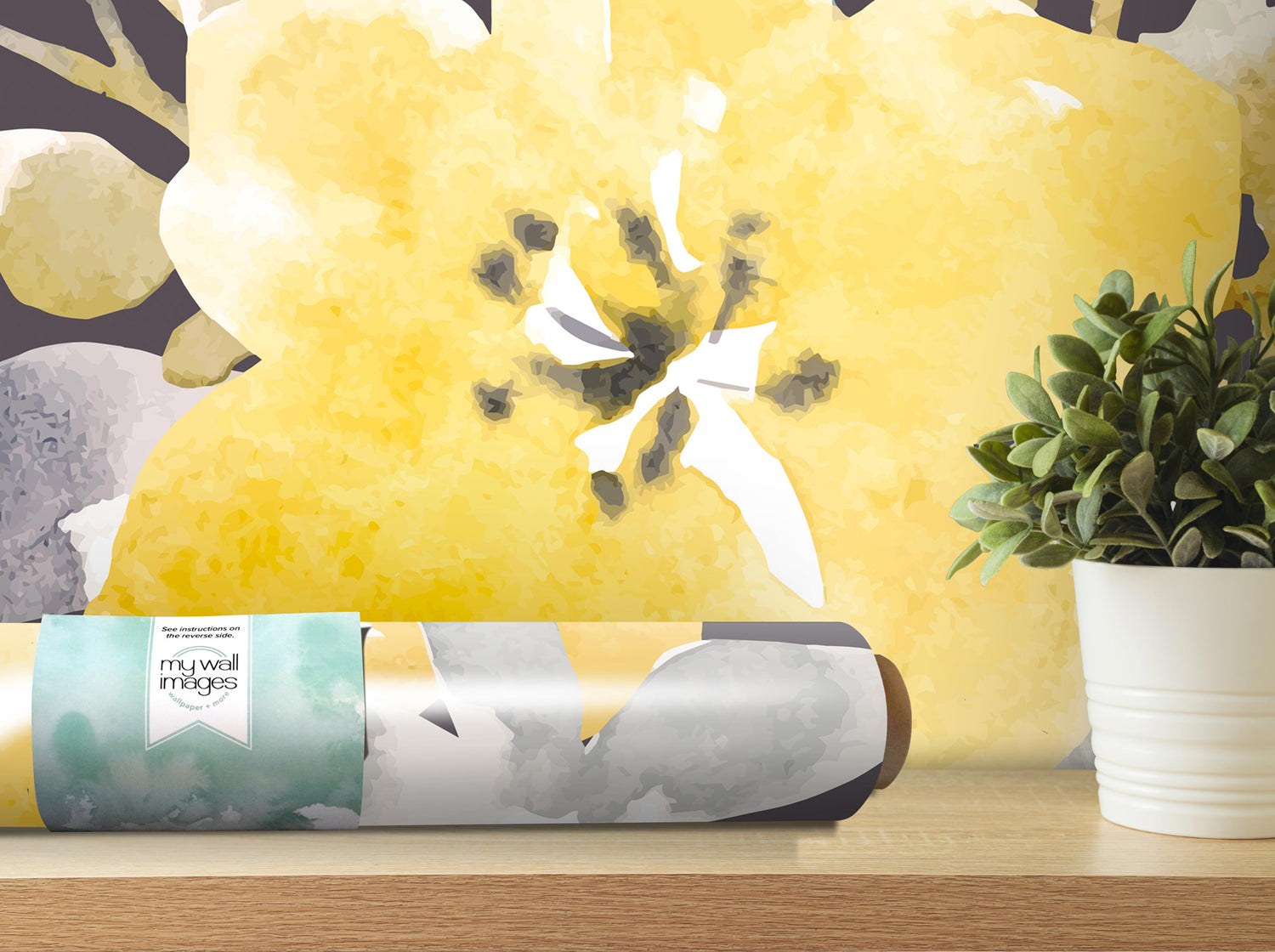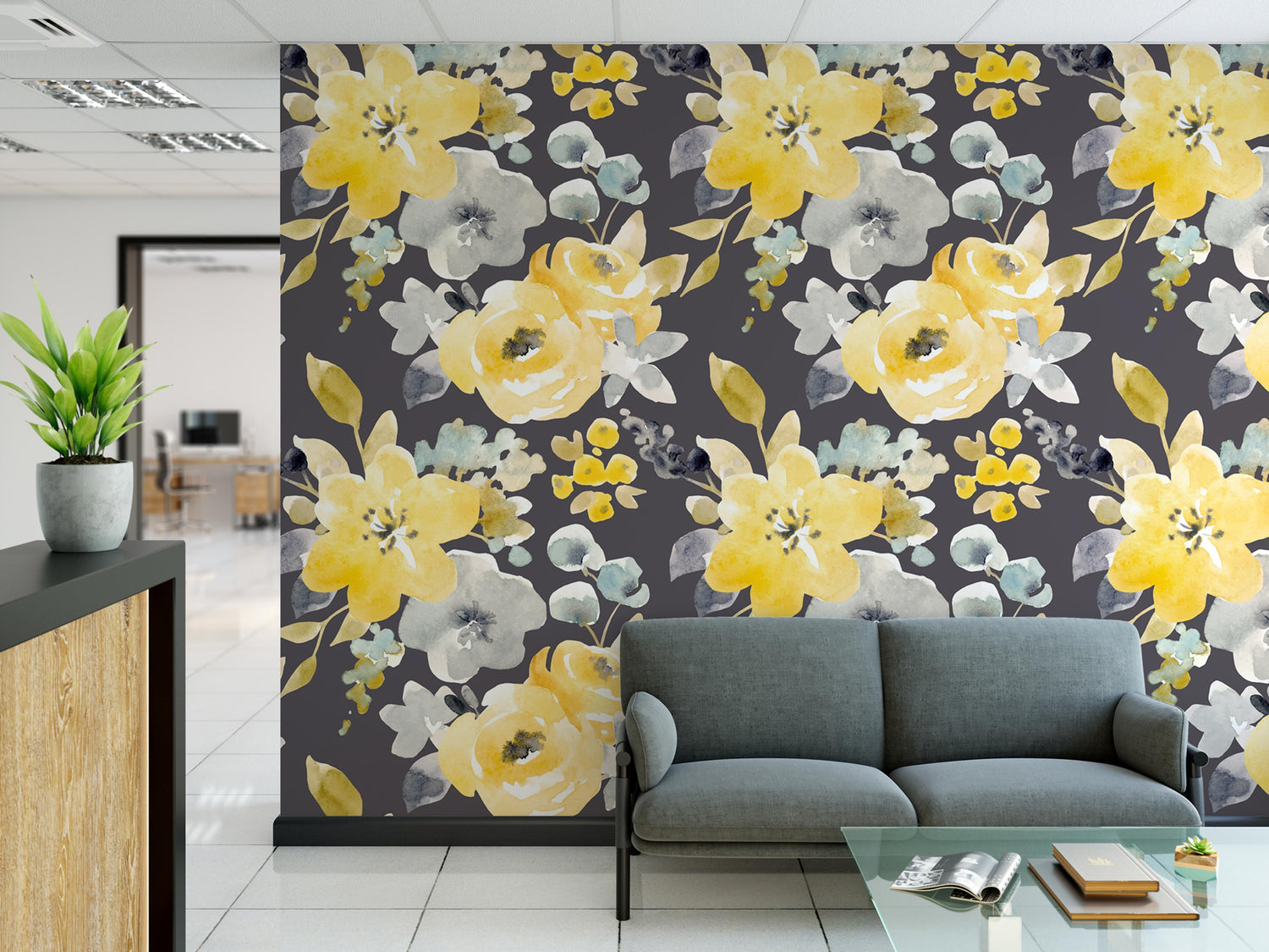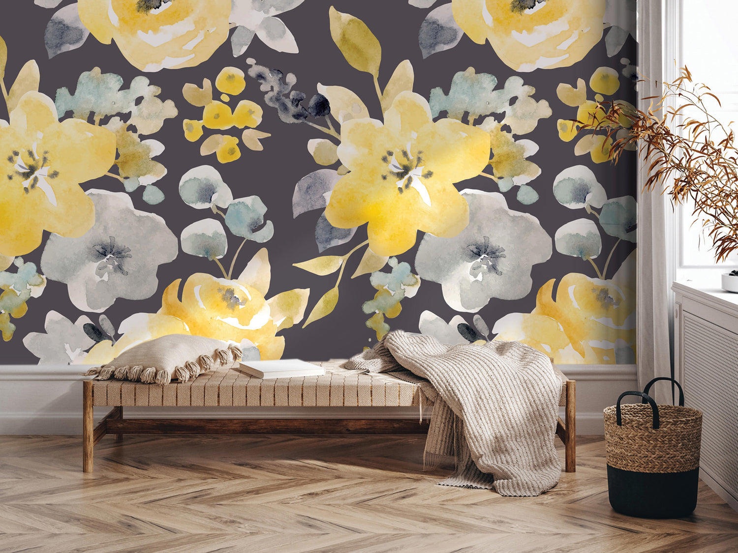 Gray & Yellow Floral Watercolor Wallpaper | Peel and Stick Mural (MW1042)
