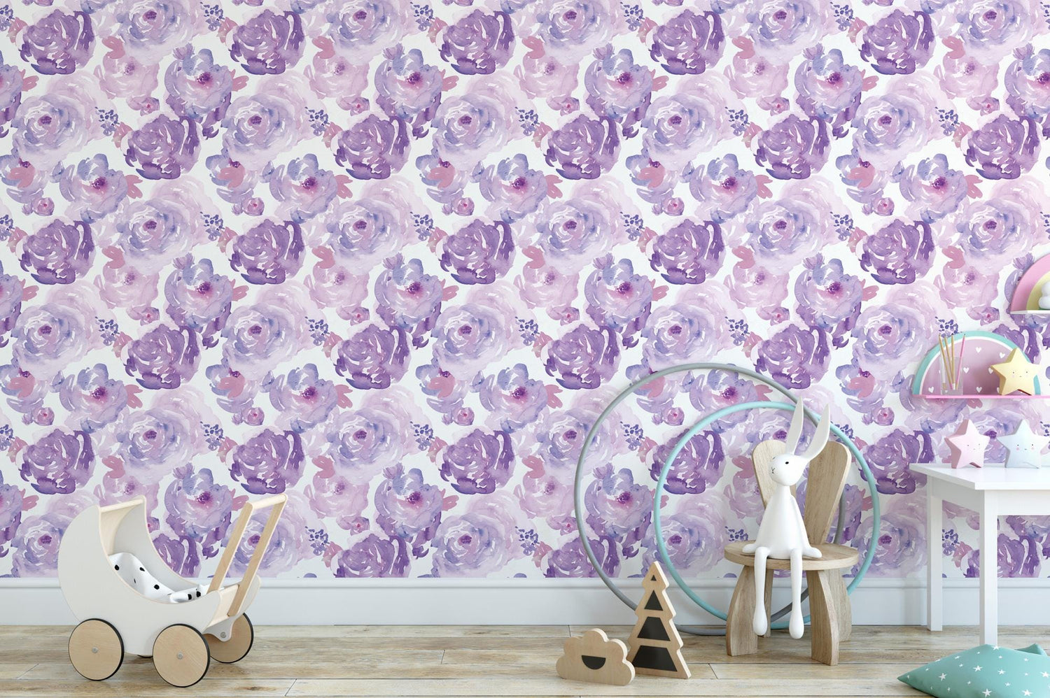 Watercolor Purple Floral Removable Wallpaper, Wall Art, Peel and Stick Wallpaper, Girl Wallpaper, Nursery, Room Decor, Accent Wall