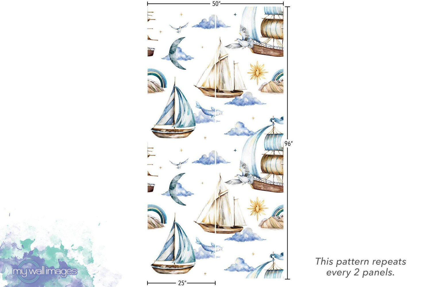Watercolor Sailboats Removable Wallpaper, Wall Art, Peel and Stick Wallpaper, Sailing Mural, Accent Wall, Boys Nursery, Boys Room