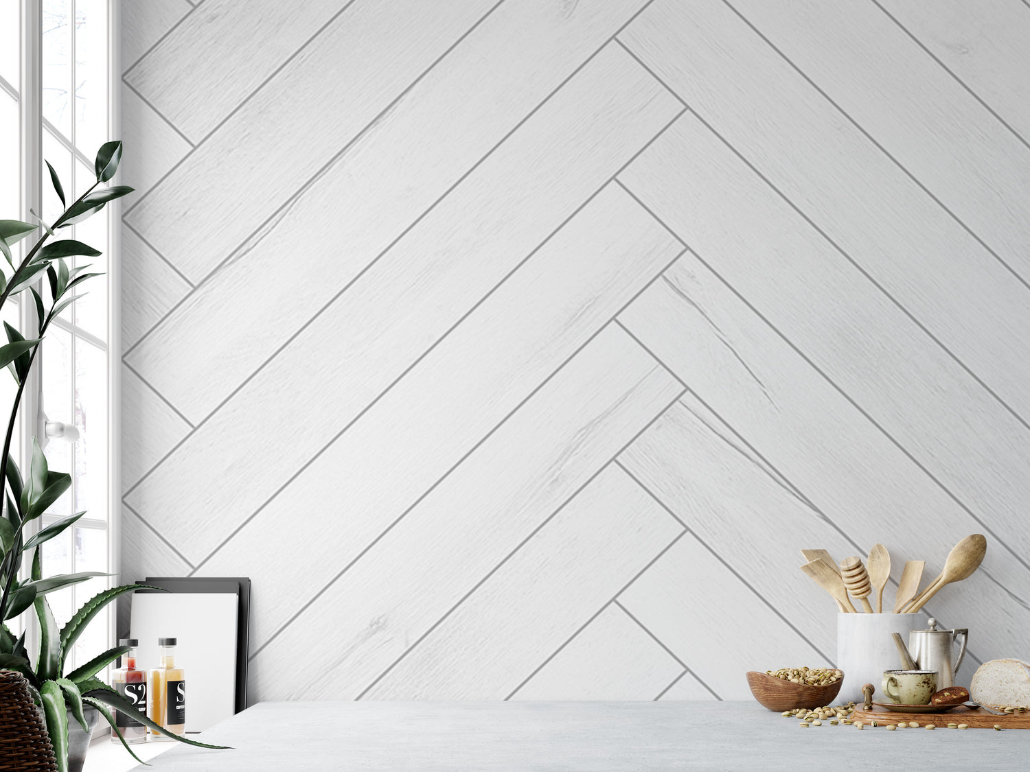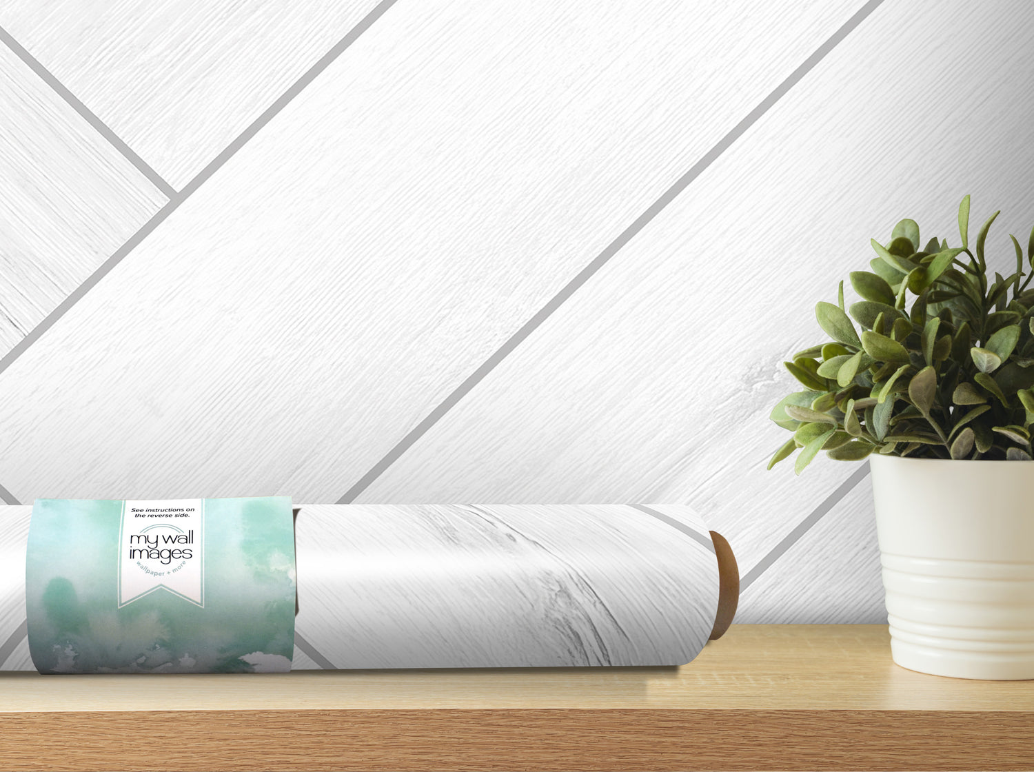 White Wood Herringbone Shiplap Wallpaper | Peel and Stick Mural (MW1864)